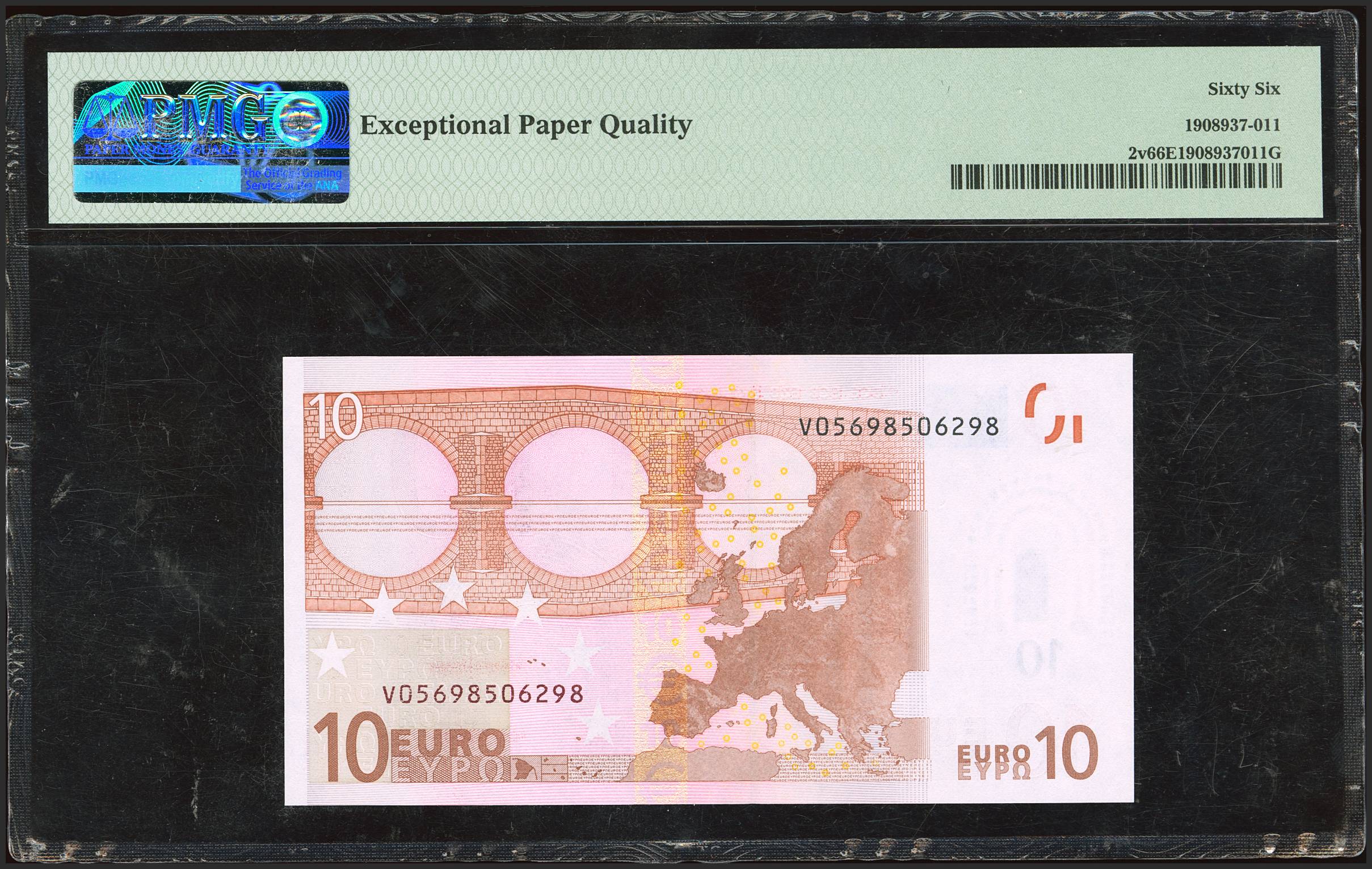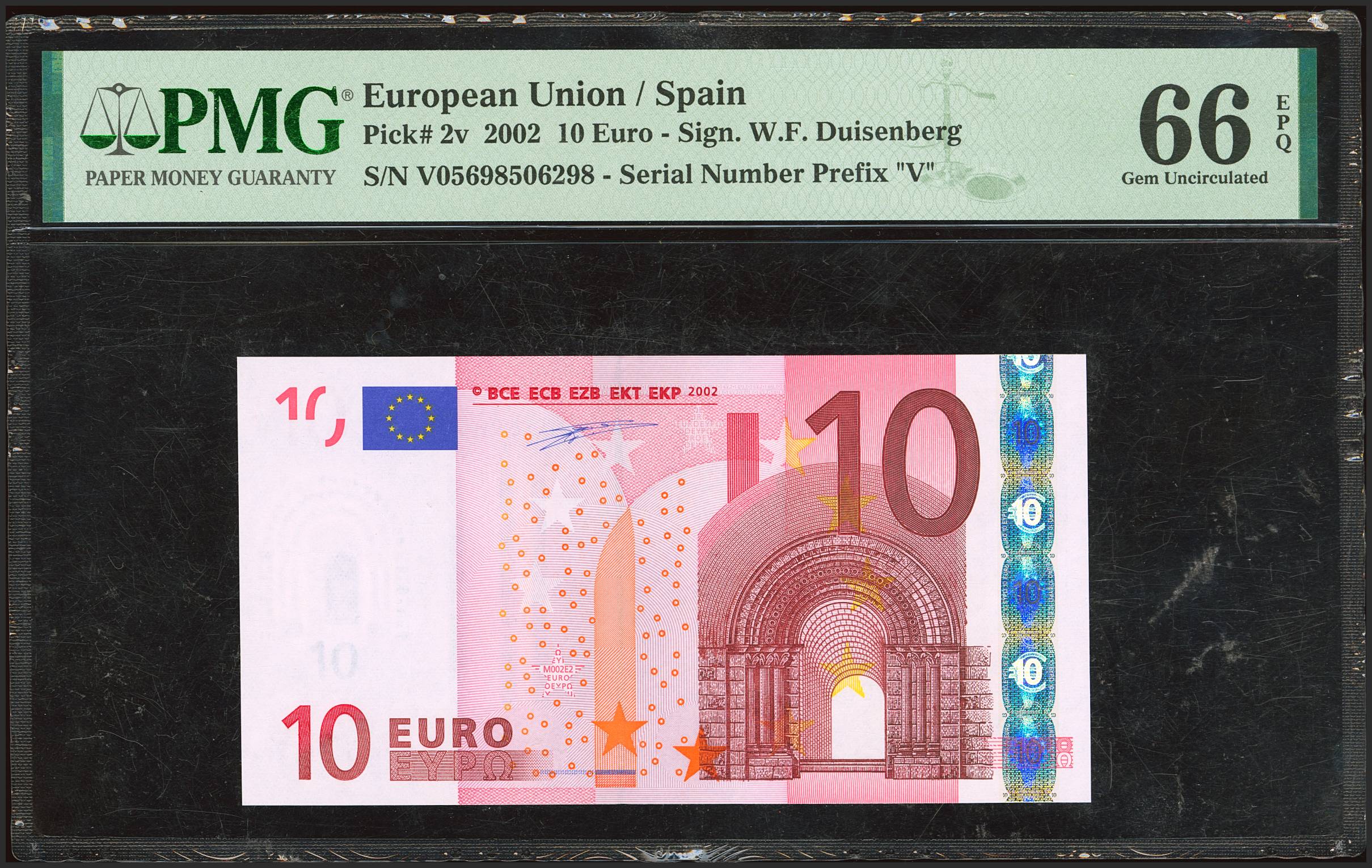 10 Euros. 1 de Enero de 2002. Firma Duisenberg. Serie V (España). (Edifil 2023: 487, Pick: 2v). SC. Encapsulado PMG66EPQ.