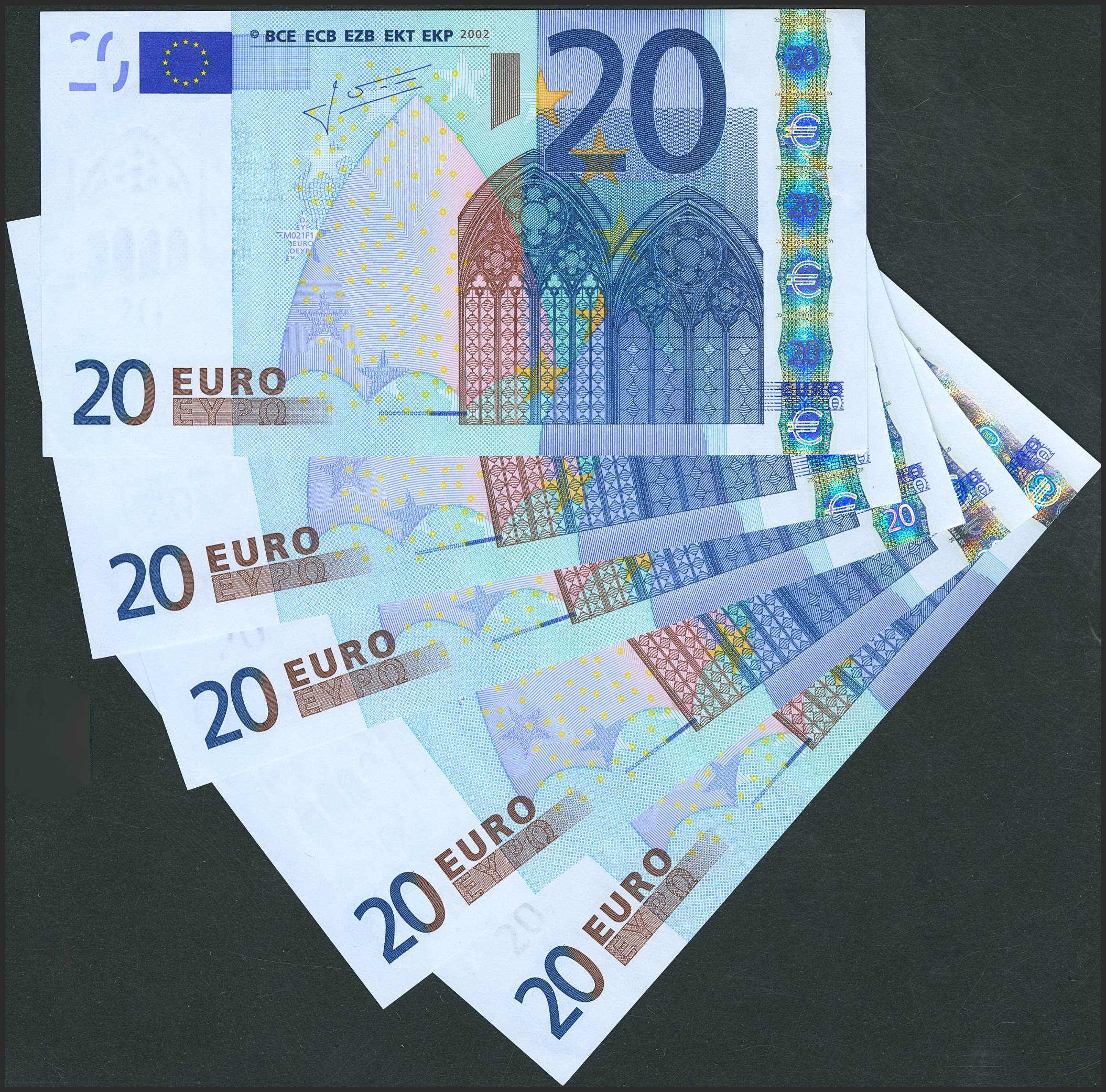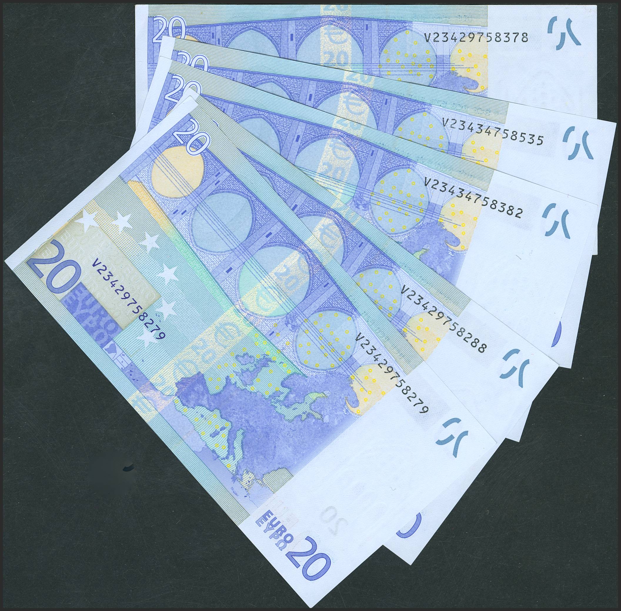 Conjunto de 5 billetes de 20 Euros, algunos correlativos entre sí, emitidos el 1 de Enero de 2002, con la firma Trichet y la Serie V (España). (Edifil 2023: 488). SC/SC-.