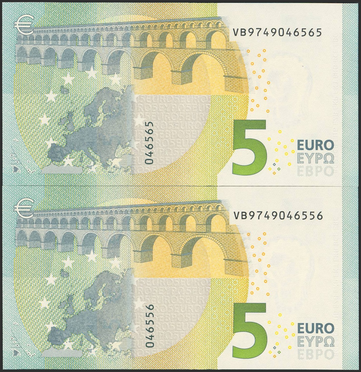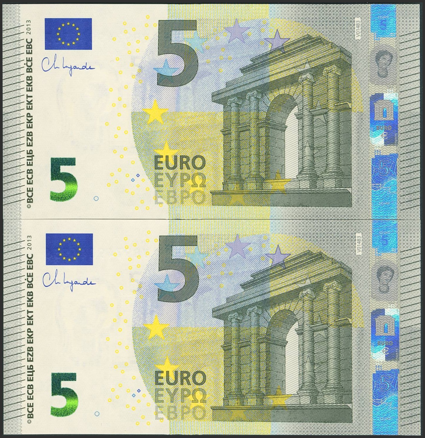 5 Euros. 2 de Mayo de 2013. Pareja correlativa (cabe recordar que el último dígito de la numeración de todos los billetes denominados en euro es para el control interno del Banco Central Europeo, el que marca la correlatividad de los billetes es el penúltimo dígito). Firma Lagarde. Serie VB (España). (Edifil 2023: 493A). SC.