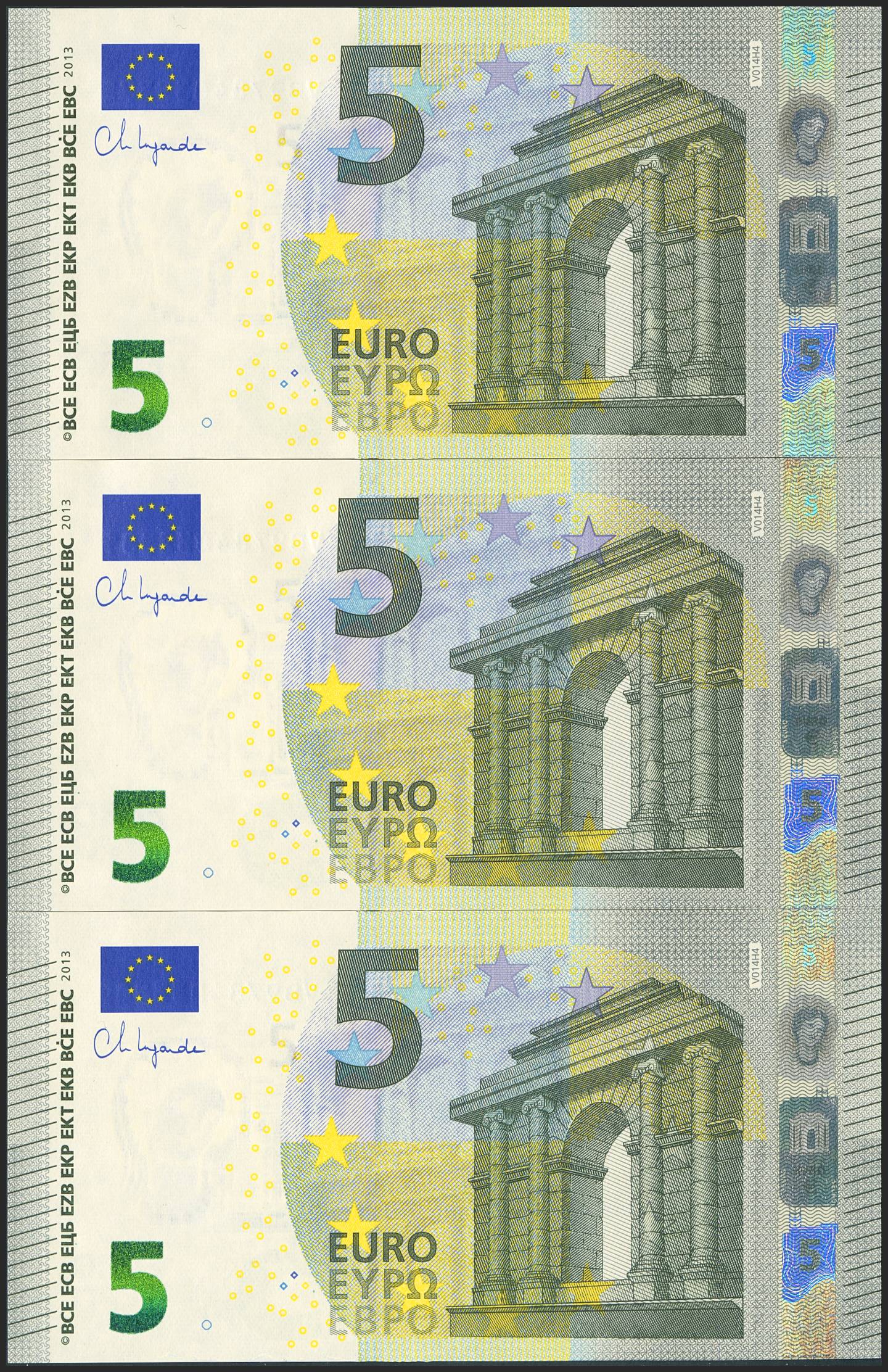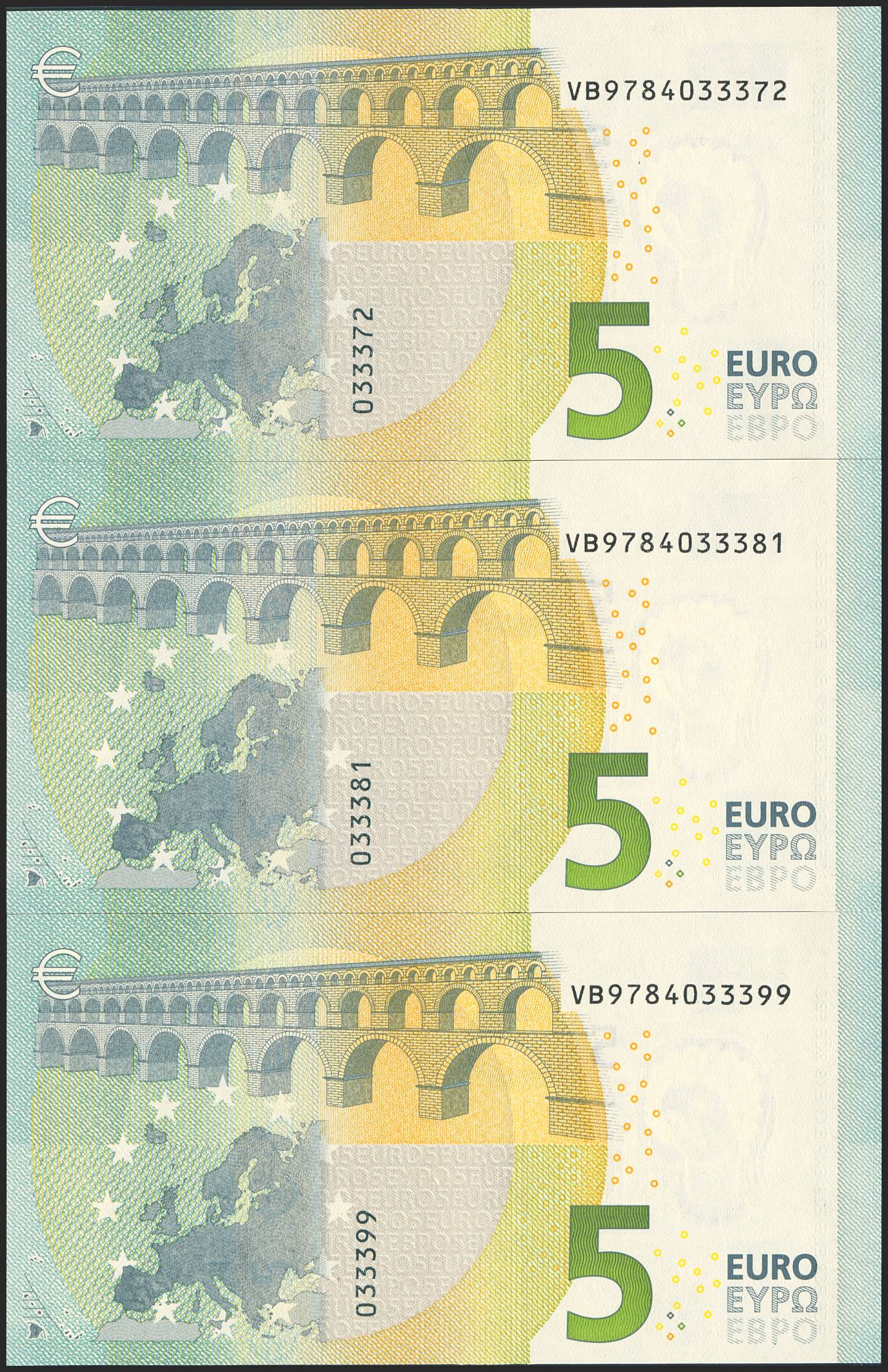 5 Euros. 2013. Trío correlativo (cabe recordar que el último dígito de la numeración de todos los billetes denominados en euro es para el control interno del Banco Central Europeo, el que marca la correlatividad de los billetes es el penúltimo dígito). Firma Lagarde. Serie VB (España). (Edifil 2023: 493Aa). SC.