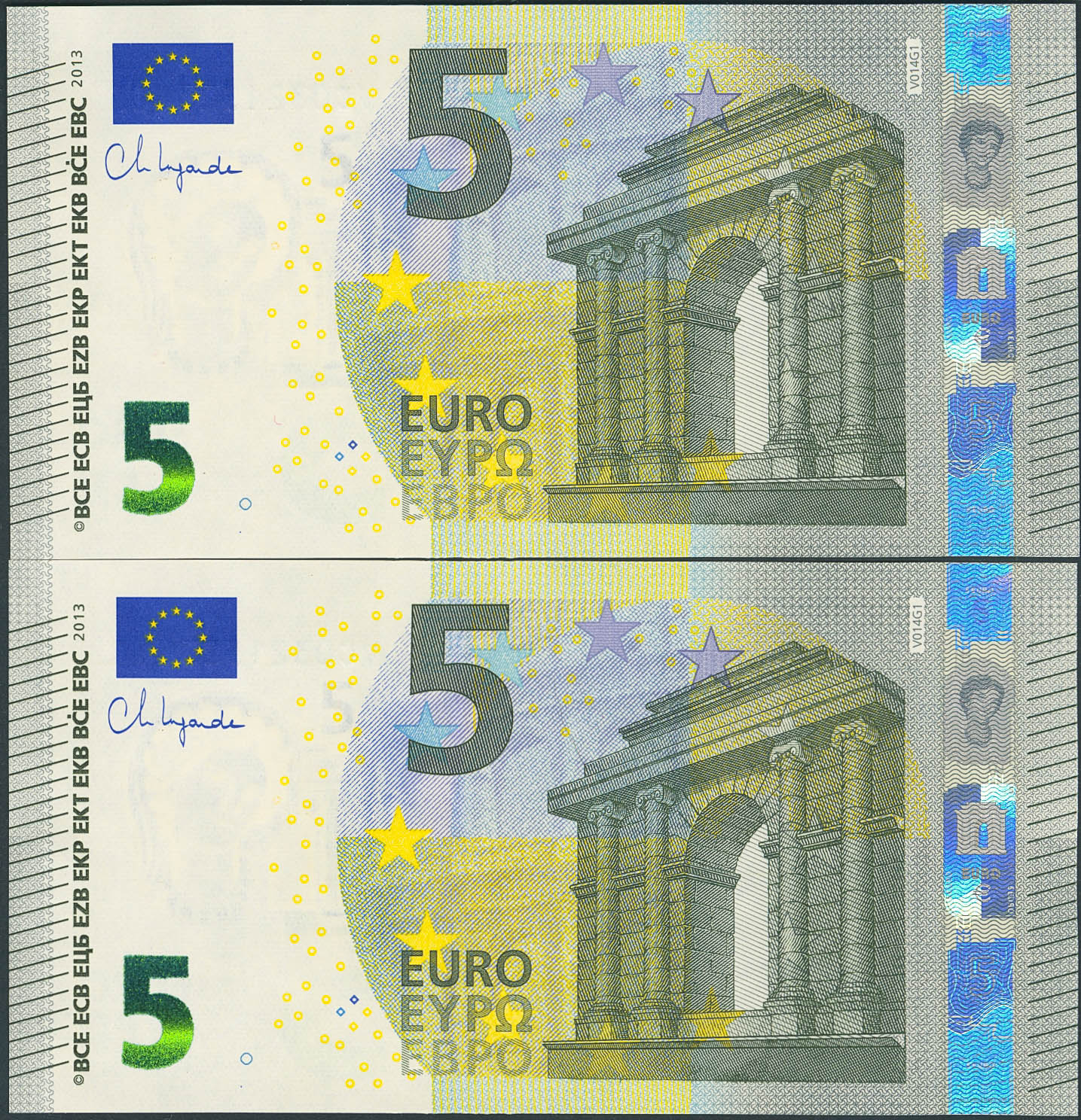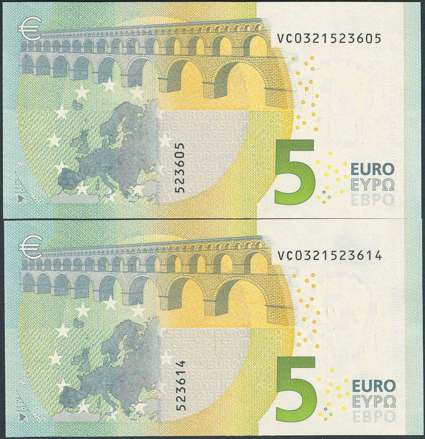 5 Euros. Noviembre 2019. Pareja correlativa (cabe recordar que el último dígito de todos los billetes denominados en euros es para control interno del Banco Central Europeo, el que marca la correlatividad de los billetes es el penúltimo dígito). Firma Lagarde. Serie V (España). (Edifil 2023: 493Aa). SC