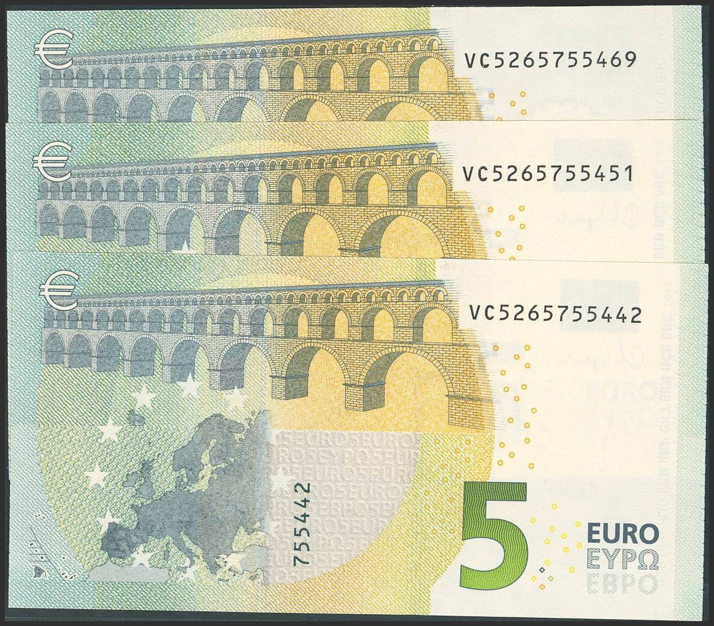 5 Euros. Noviembre 2013. Trío correlativo (cabe recordar que el último dígito de todos los billetes denominados en euros es para control interno del Banco Central Europeo, el que marca la correlatividad de los billetes es el penúltimo dígito). Firma Lagarde. Serie VC (España). (Edifil 2023: 493Aa). SC.