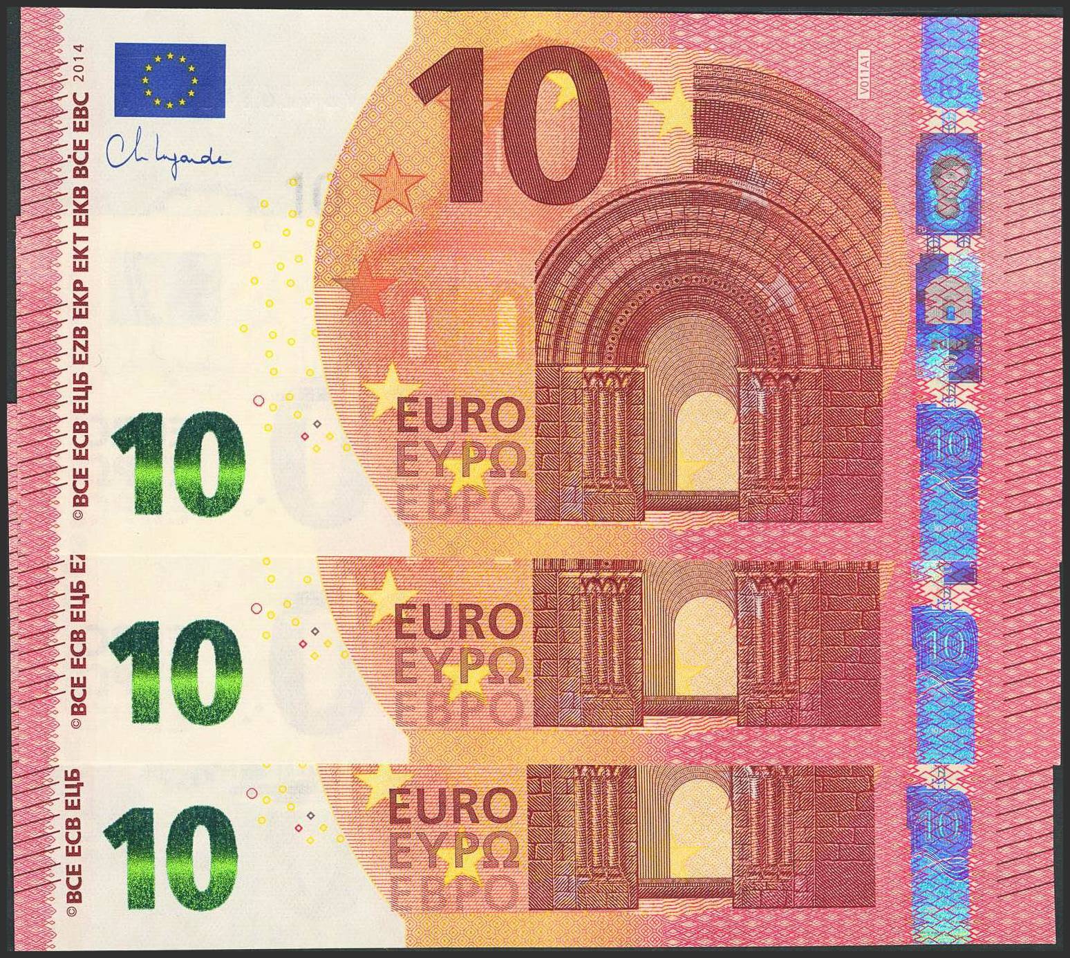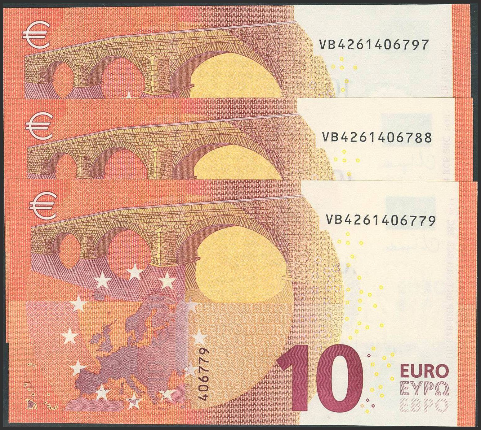 10 Euros. 23 de Septiembre de 2014. Serie VB (España). (Edifil 2023: 494A, Pick: 21v). Apresto original. SC. Trío correlativo (cabe recordar que el último dígito de todos los billetes denominados en euros es para control interno del Banco Central Europeo, el que marca la correlatividad de los billetes es el penúltimo dígito). Firma Lagarde. Serie VC (España). (Edifil 2023: 494A). SC.