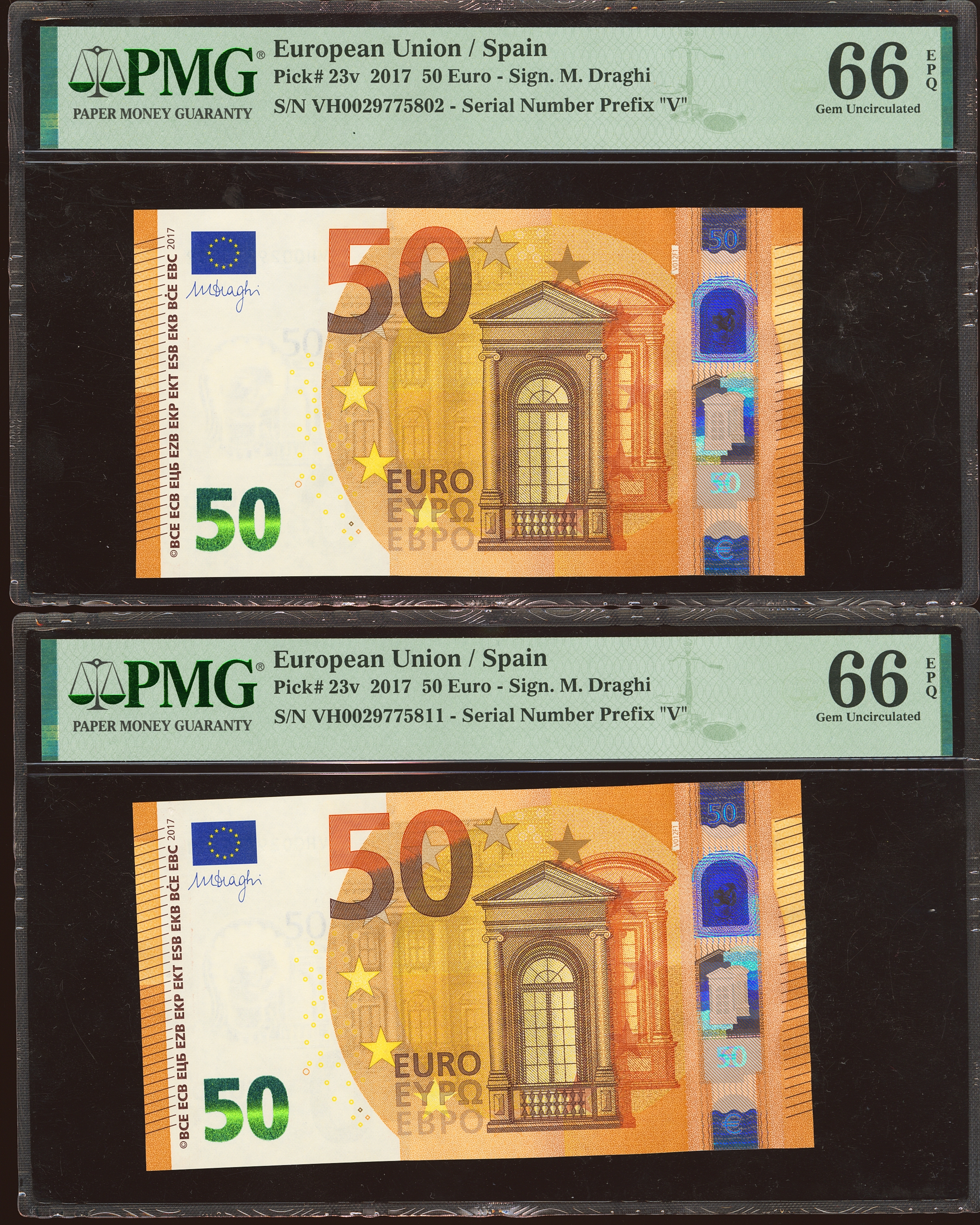 50 Euros. 4 de Abril de 2017. Pareja correlativa (cabe recordar que el último dígito de todos los billetes denominados en euros es para control interno del Banco Central Europeo, el que marca la correlatividad de los billetes es el penúltimo dígito). Firma Draghi. Serie especial VH (España). (Edifil 2023: 496b). Rara pareja. Encapsulados PMG66EPQ, ambos.