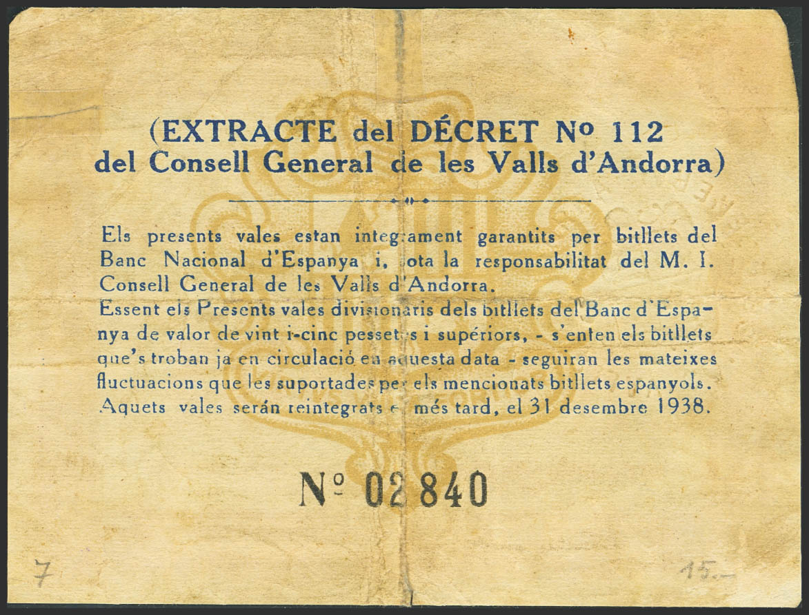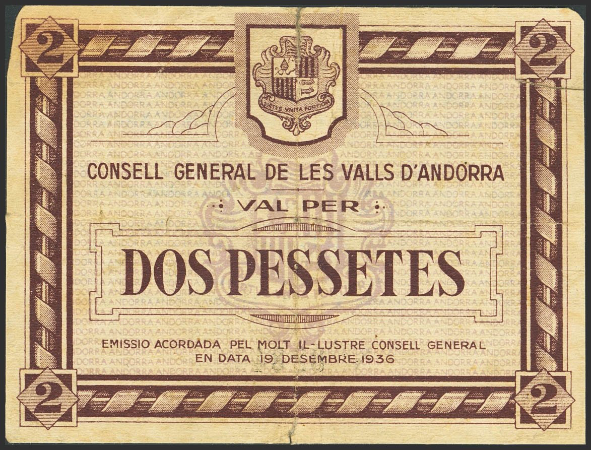 ANDORRA. 2 Pessetes. 19 de Diciembre de 1936. Sin serie. (Edifil 2023: 5). Raro. MBC-.