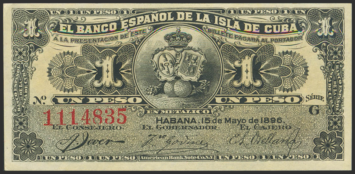 BANCO ESPAÑOL DE LA ISLA DE CUBA. 1 Peso. 15 de Mayo de 1896. Serie G. (Edifil 2023: 71). Apresto original. SC-.