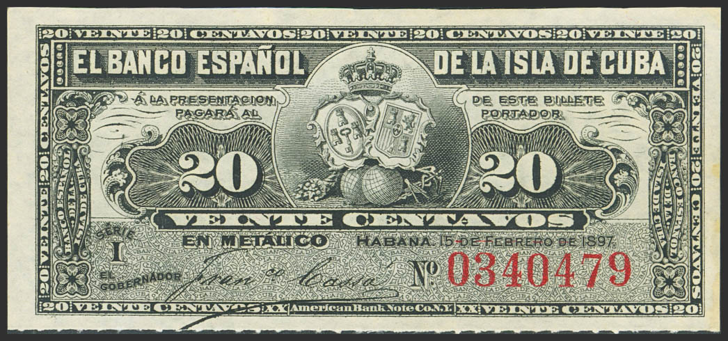 BANCO ESPAÑOL DE LA ISLA DE CUBA. 20 Centavos. 15 de Febrero de 1897. Serie I. (Edifil 2023: 85). Apresto original. SC.