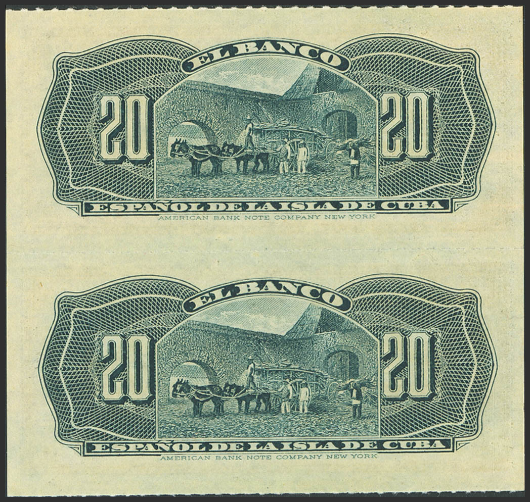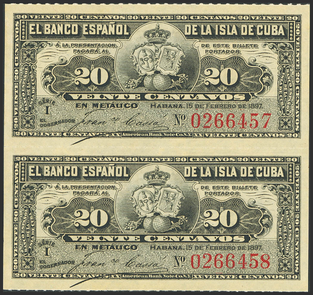 BANCO ESPAÑOL DE LA ISLA DE CUBA. Conjunto de 2 billetes correlativos de 20 Centavos (sin desprender), emitidos el 15 de Febrero de 1897 (Edifil 2023: 85). SC.