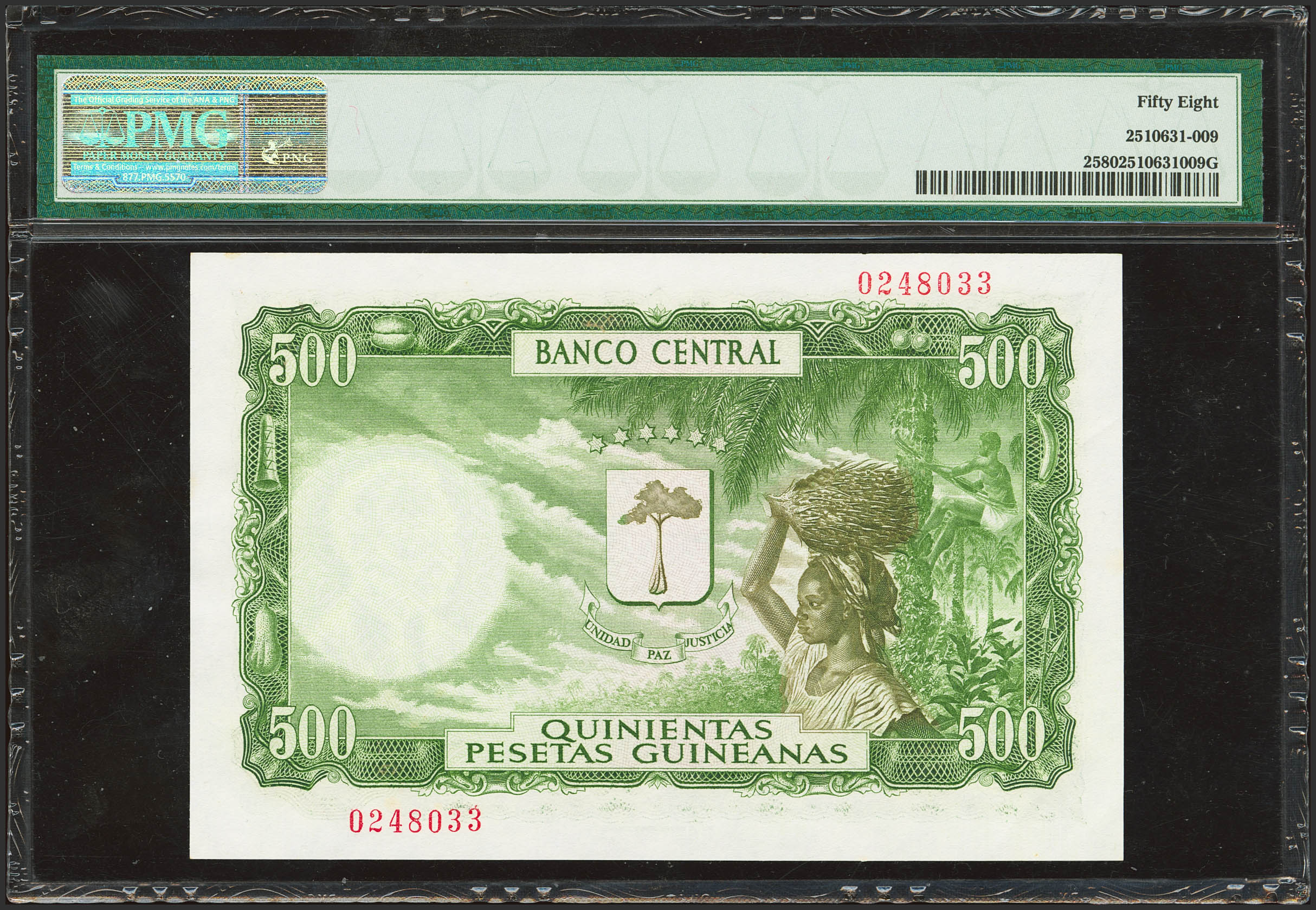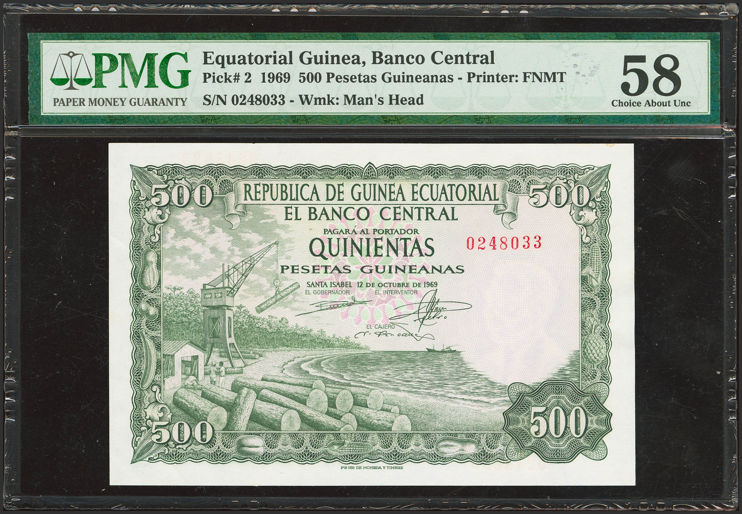 GUINEA ECUATORIAL. 500 Pesetas. 12 de Octubre de 1969. Sin serie. (Edifil 2023: 2, Pick: 2). EBC+. Encapsulado PMG58.