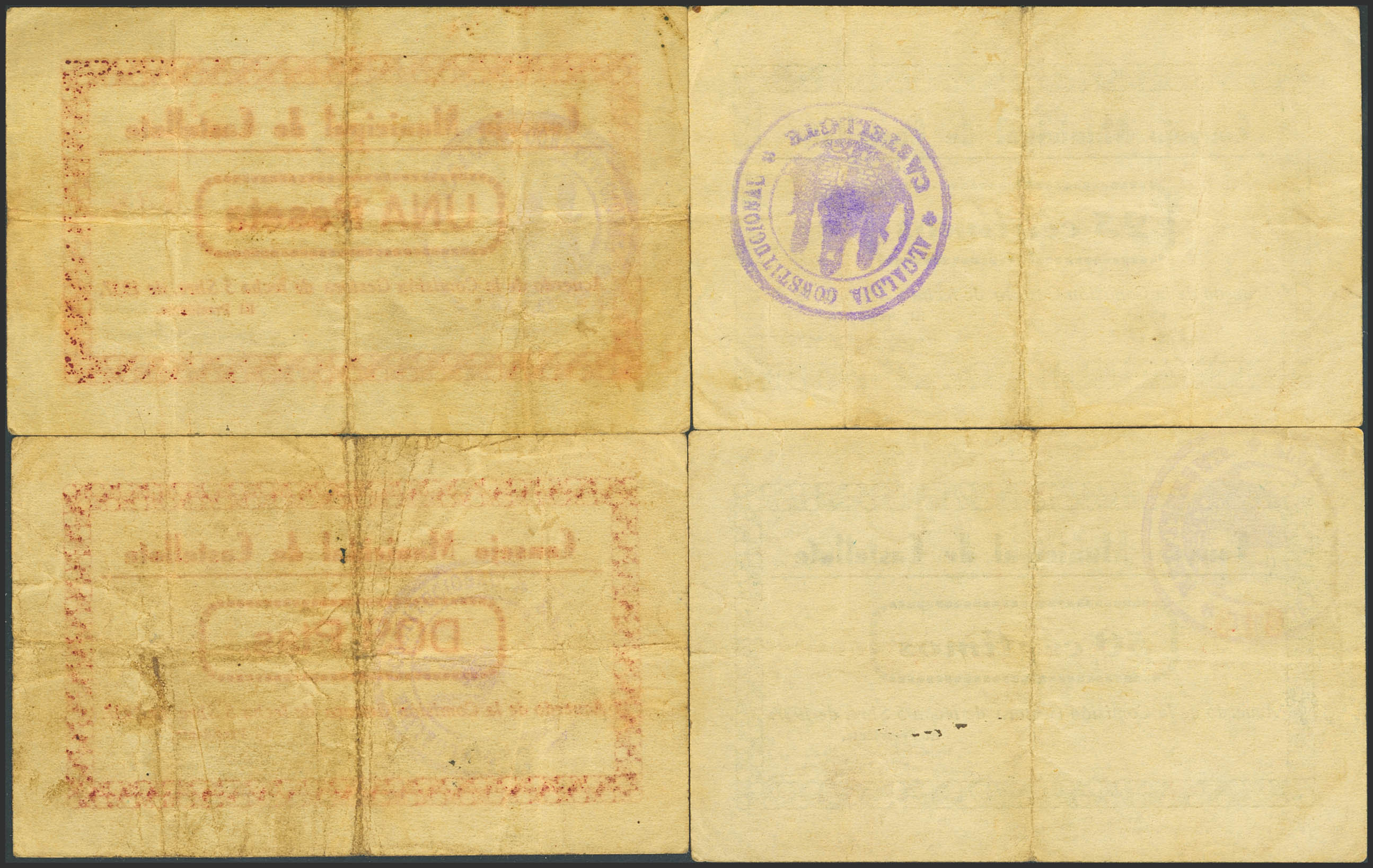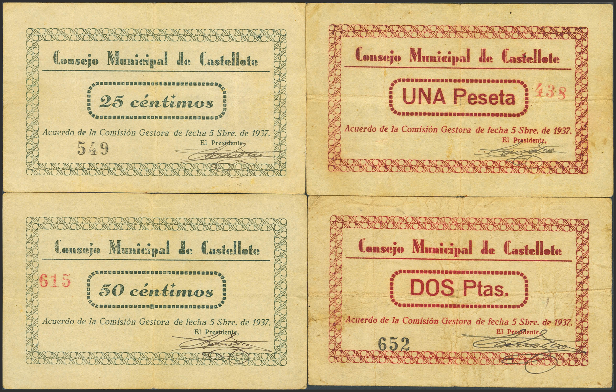 CASTELLOTE (TERUEL). 25 Céntimos, 50 Céntimos, 1 Peseta y 2 Pesetas. 5 de Septiembre de 1937. (González: 1791/94). Rara serie completa. MBC-.
