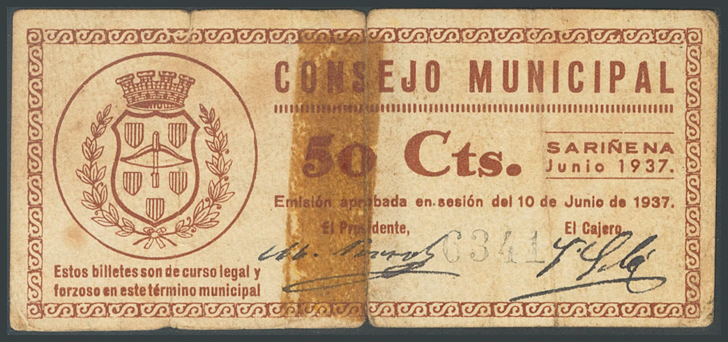 SARIÑENA (HUESCA). 50 Céntimos. 10 de Junio de 1937. (González: 4785). Presencia de restos de cinta adhesiva. RC.