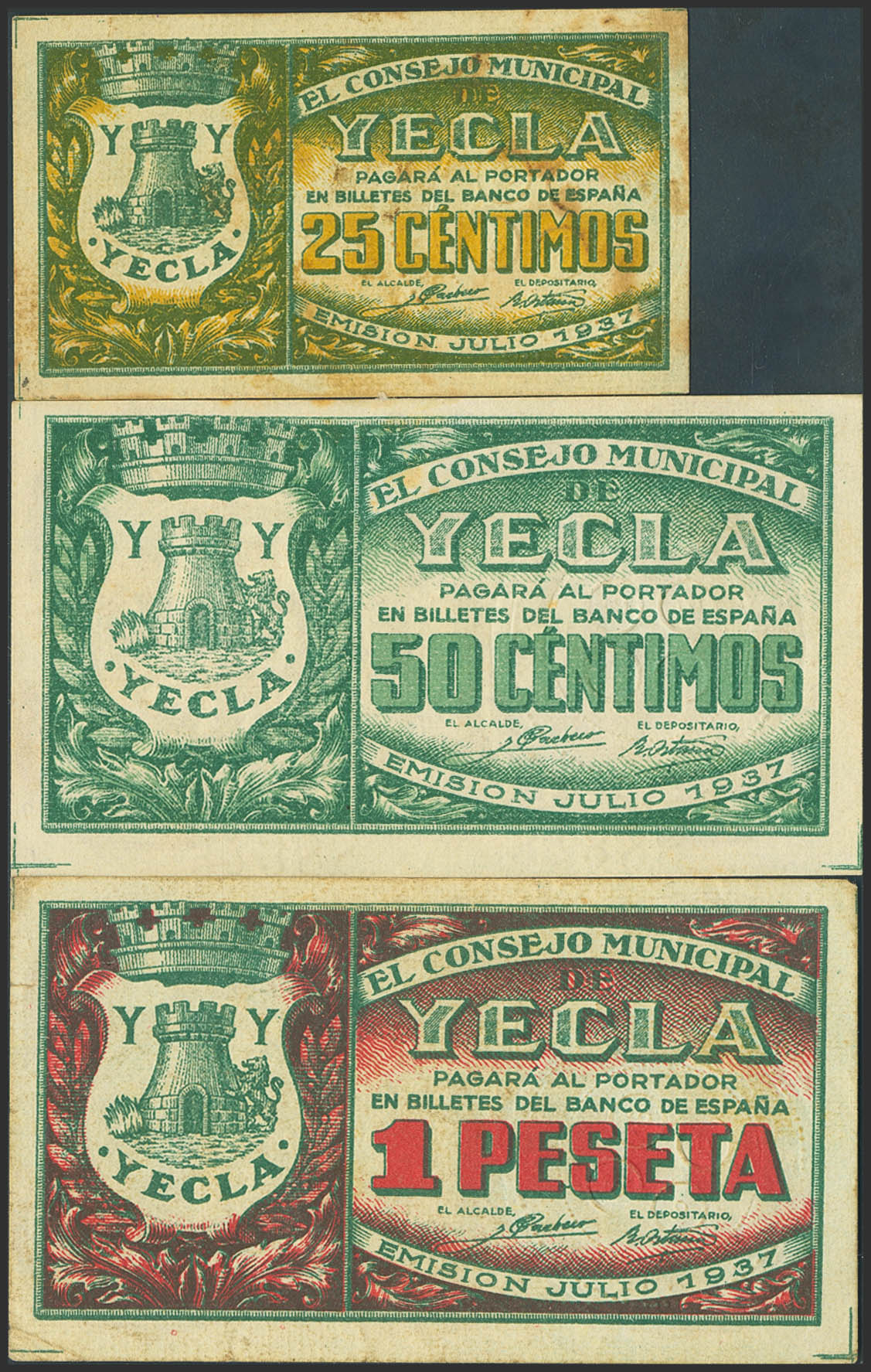 YECLA (MURCIA). 25 Céntimos, 50 Céntimos y 1 Peseta. Julio de 1937. Sin serie. (González: 5807/09). Rara serie completa. MBC+/MBC.