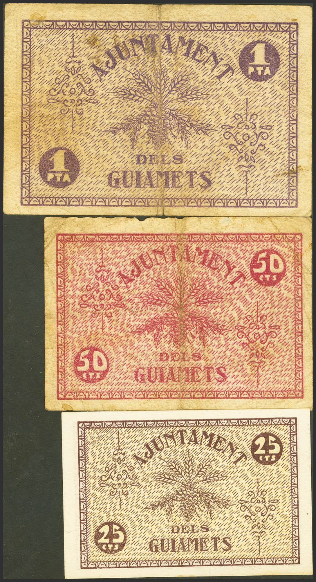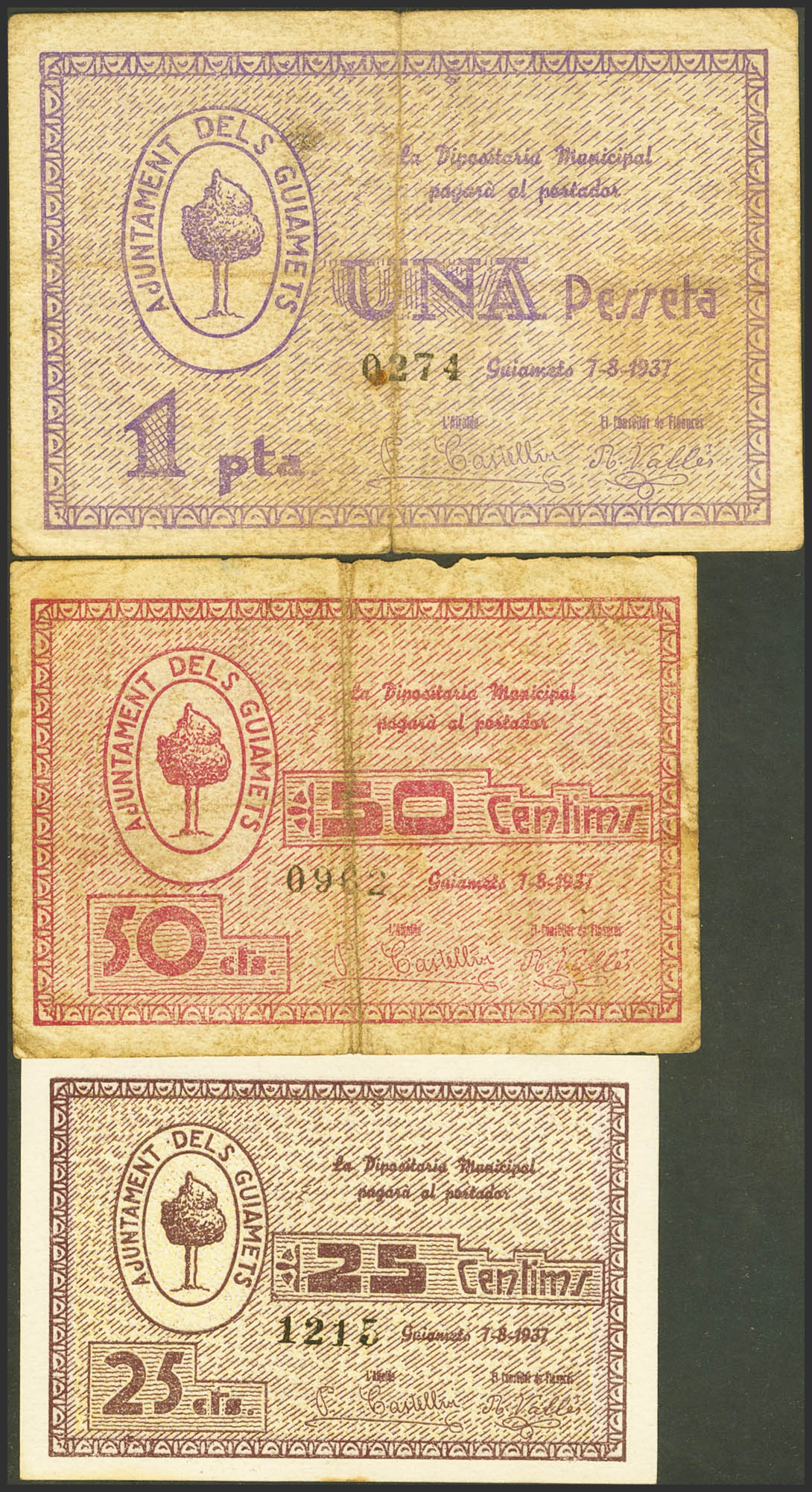 GUIAMETS (TARRAGONA). 25 Céntimos, 50 Céntimos y 1 Peseta. 7 de Agosto de 1937. (González: 8161/63). Rara serie completa. EBC+++/MBC-.