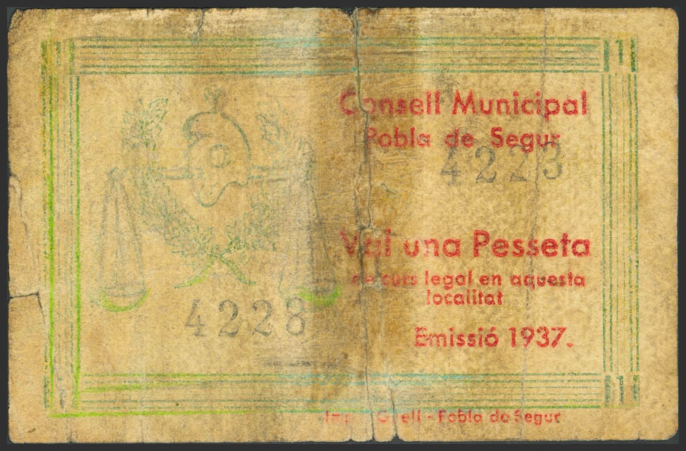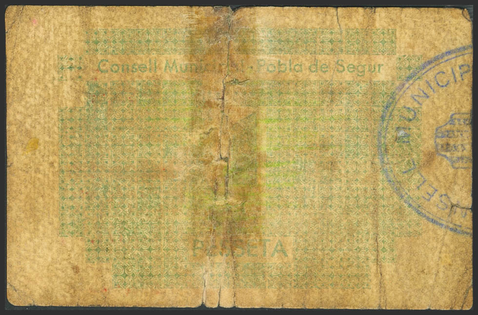 POBLA DE SEGUR (LERIDA). 1 Peseta. 1937. Serie Sin. (González: 9338). Raro, presencia de cinta adhesiva. BC-.