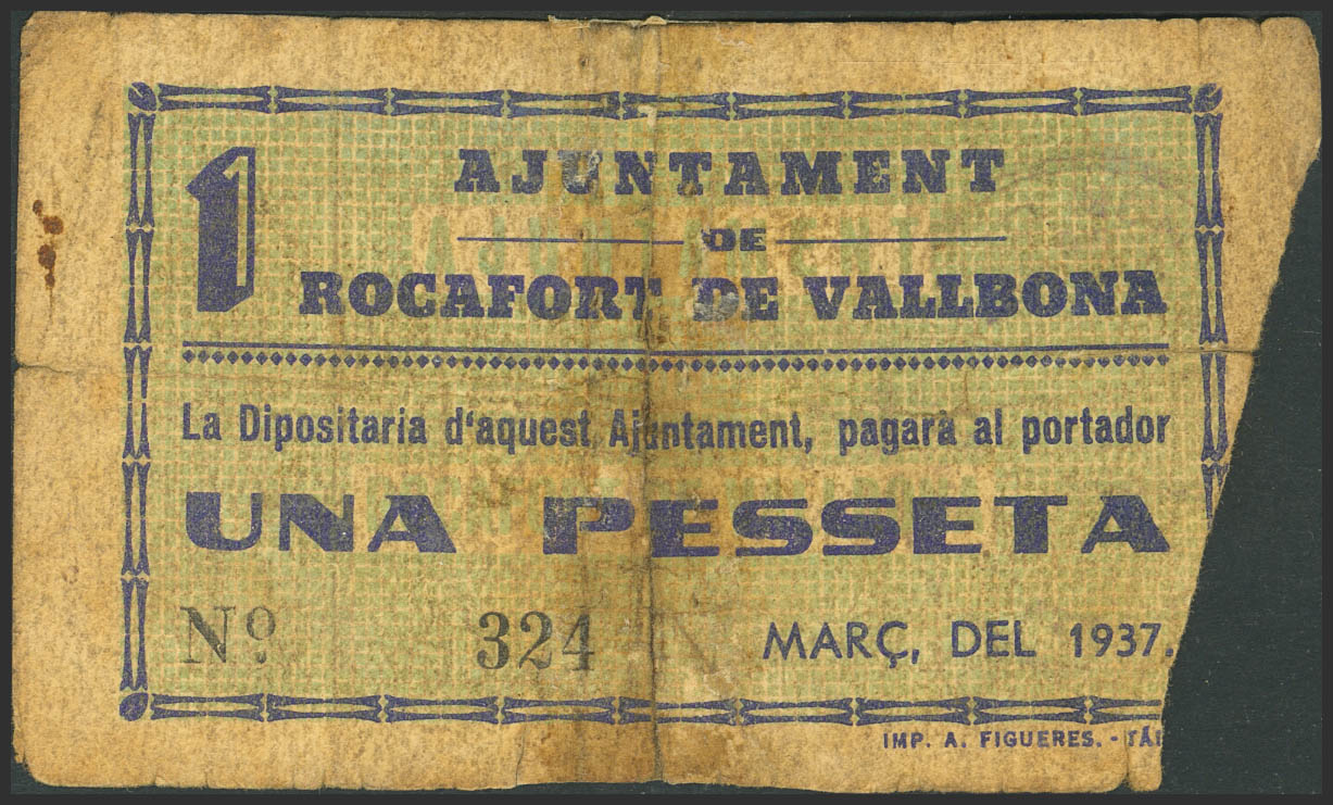 ROCAFORT DE VALLBONA (LERIDA). 1 Peseta. Marzo de 1937. Sin serie. (González: 9708). Muy raro, falta de billete y presencia de cinta adhesiva. RC.