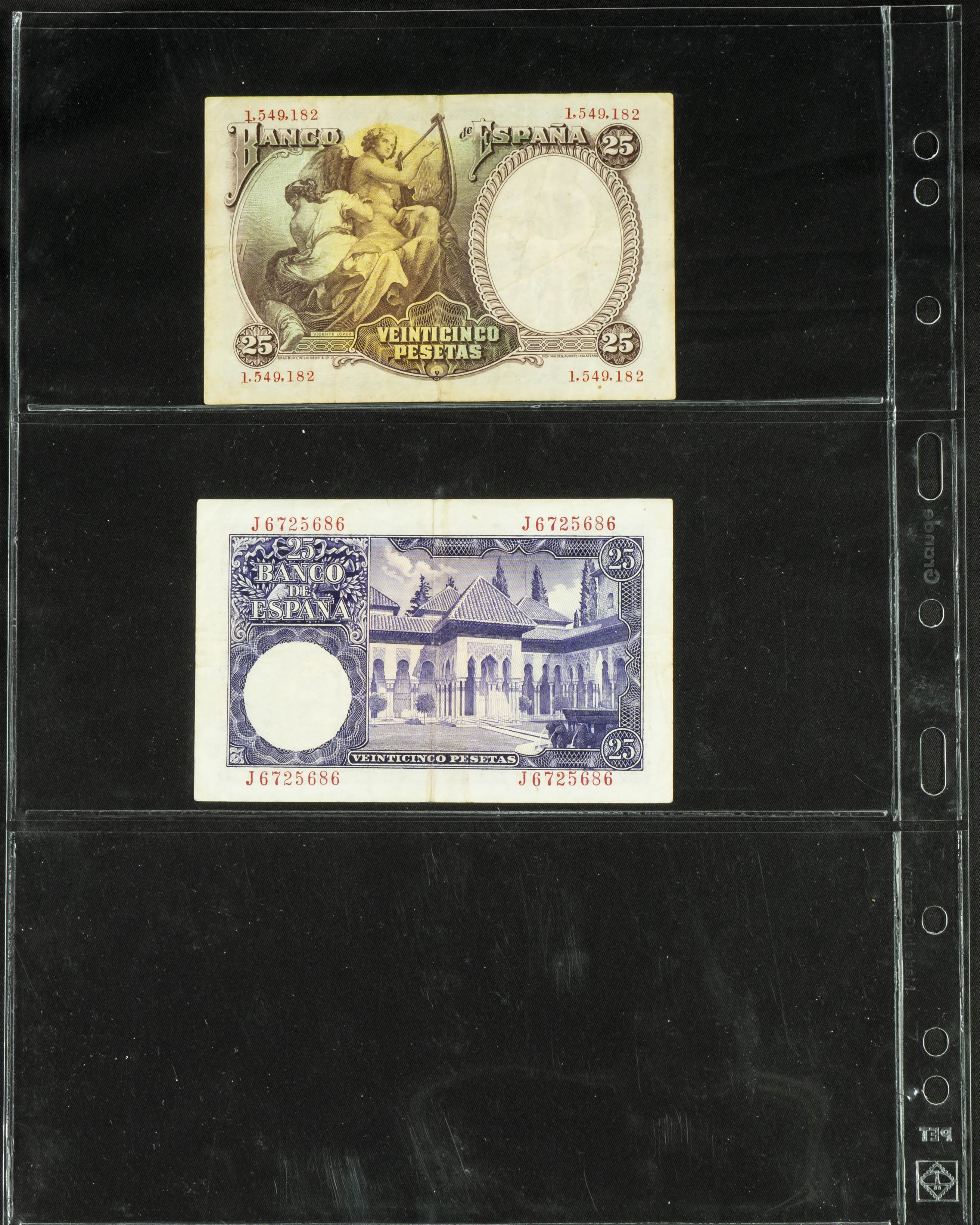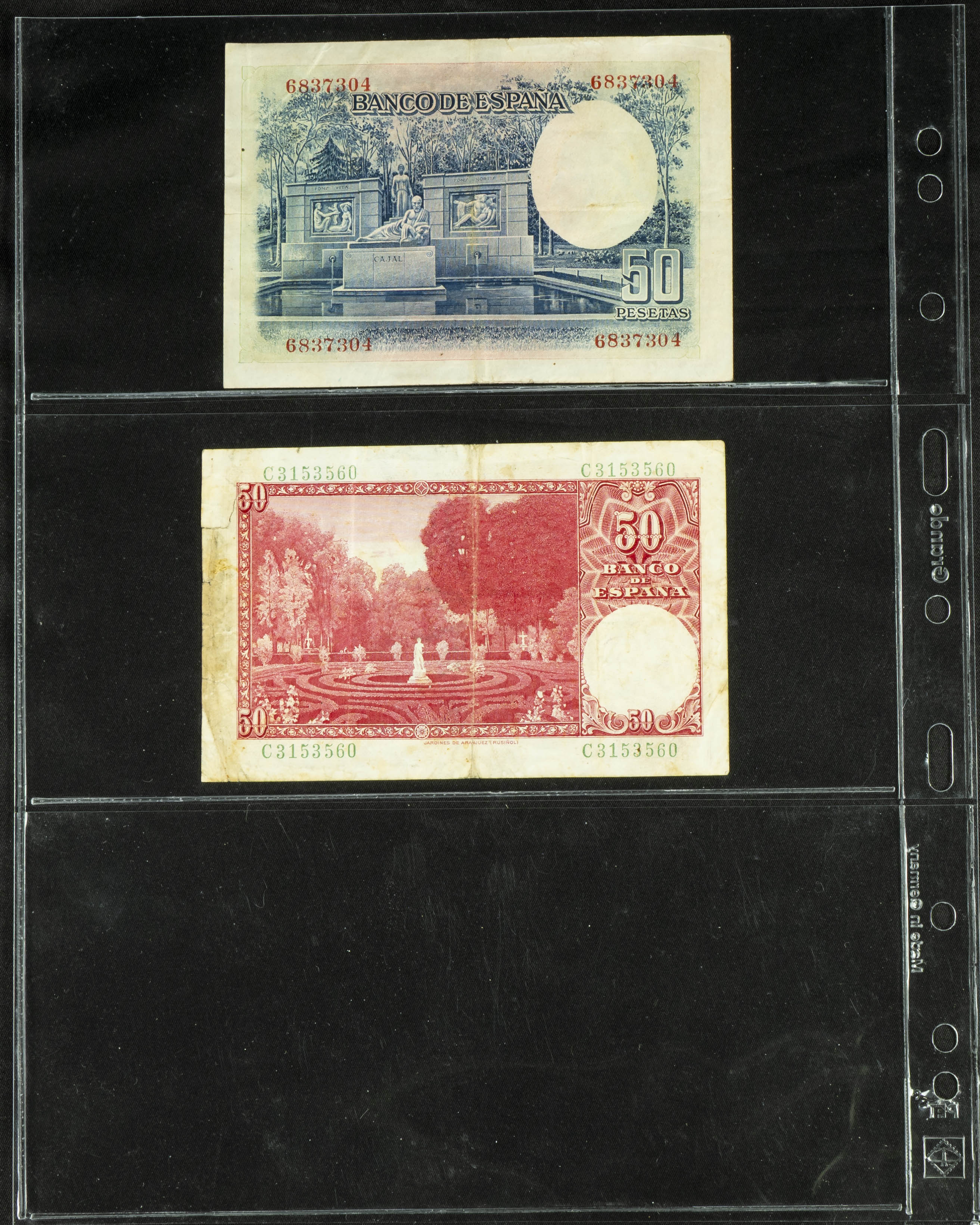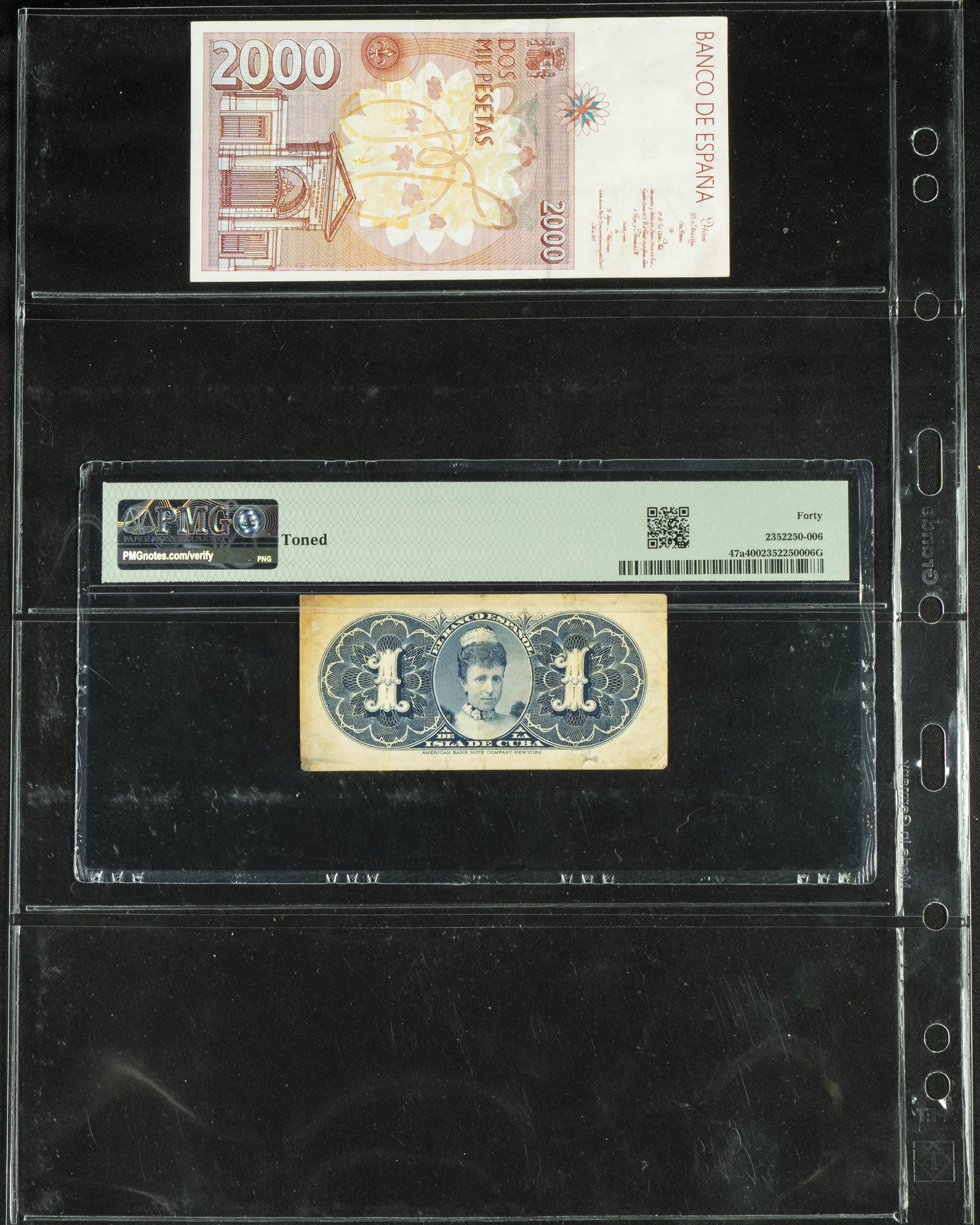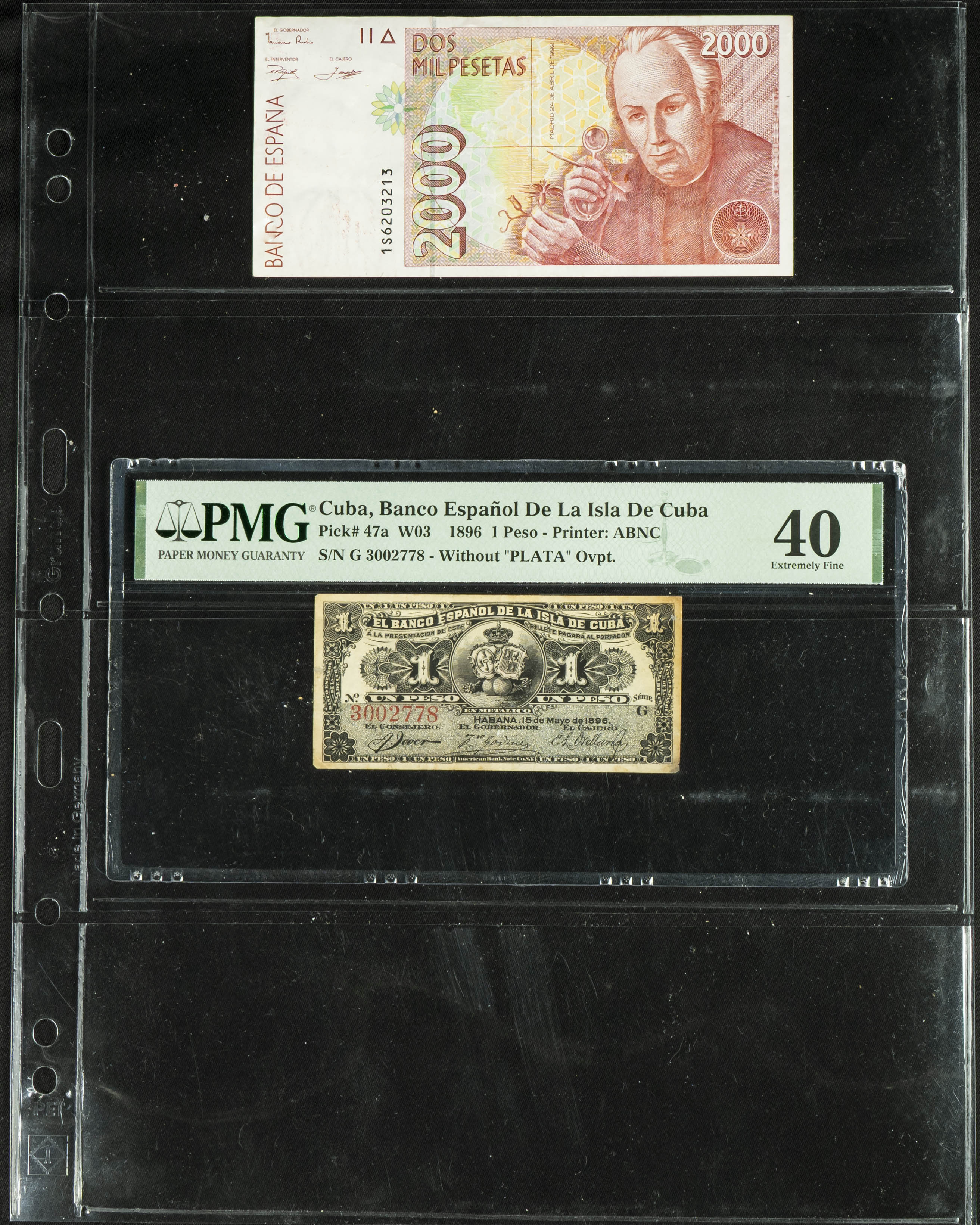 Interesante conjunto de más de 30 billetes del Banco de España de diferentes emisiones y en diversas calidades, incluyendo un billete de Cuba Colonial encapsulado por PMG. A EXAMINAR