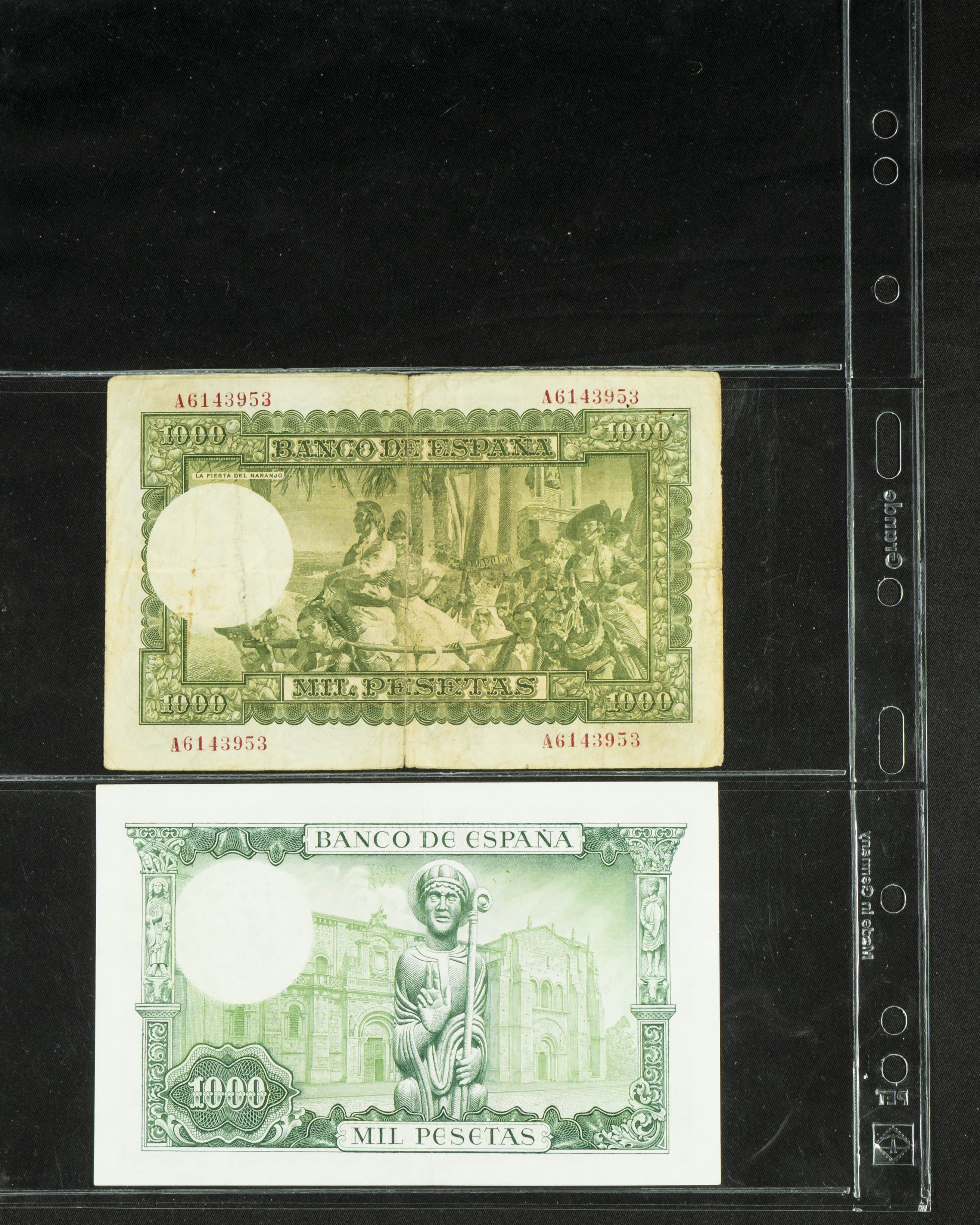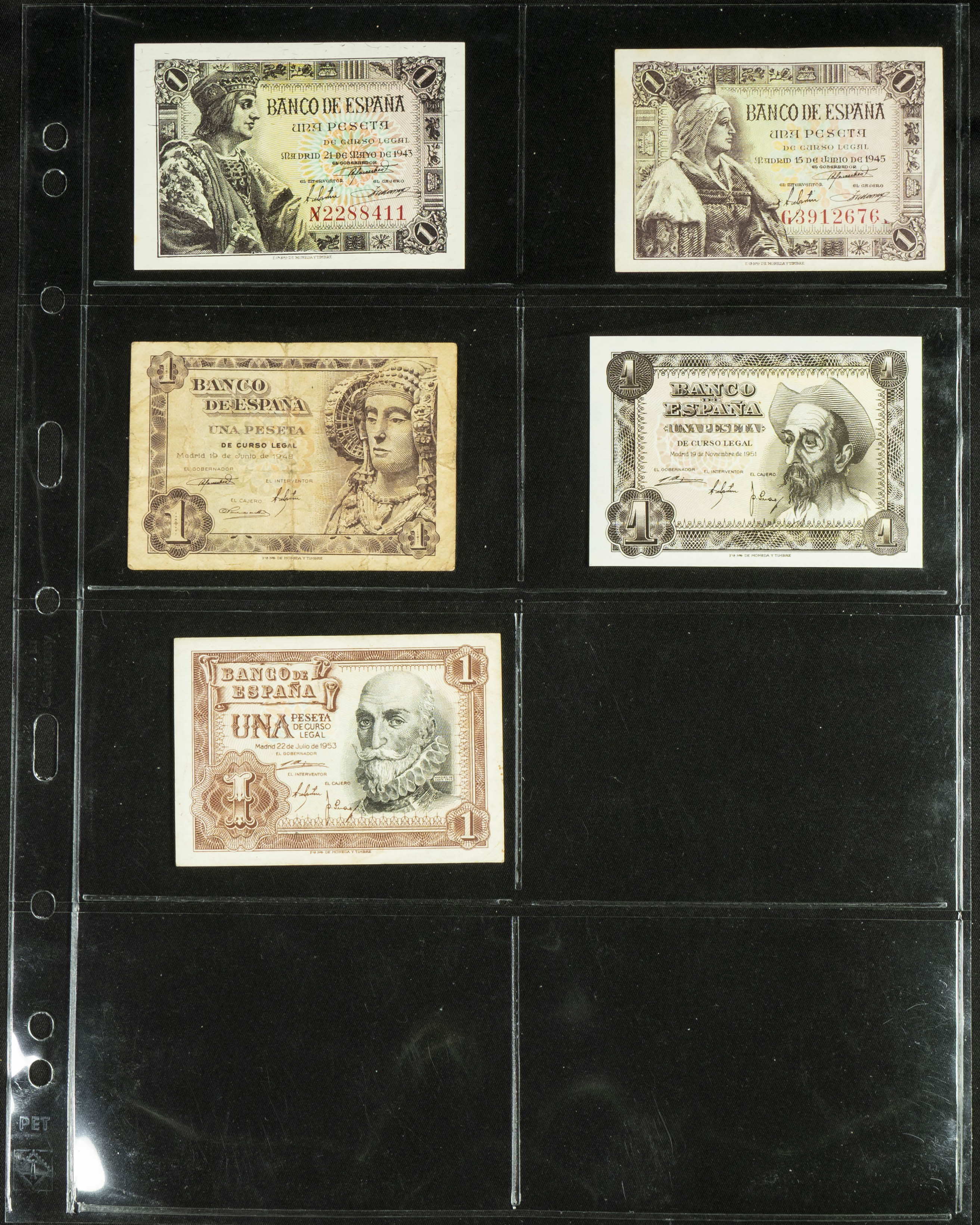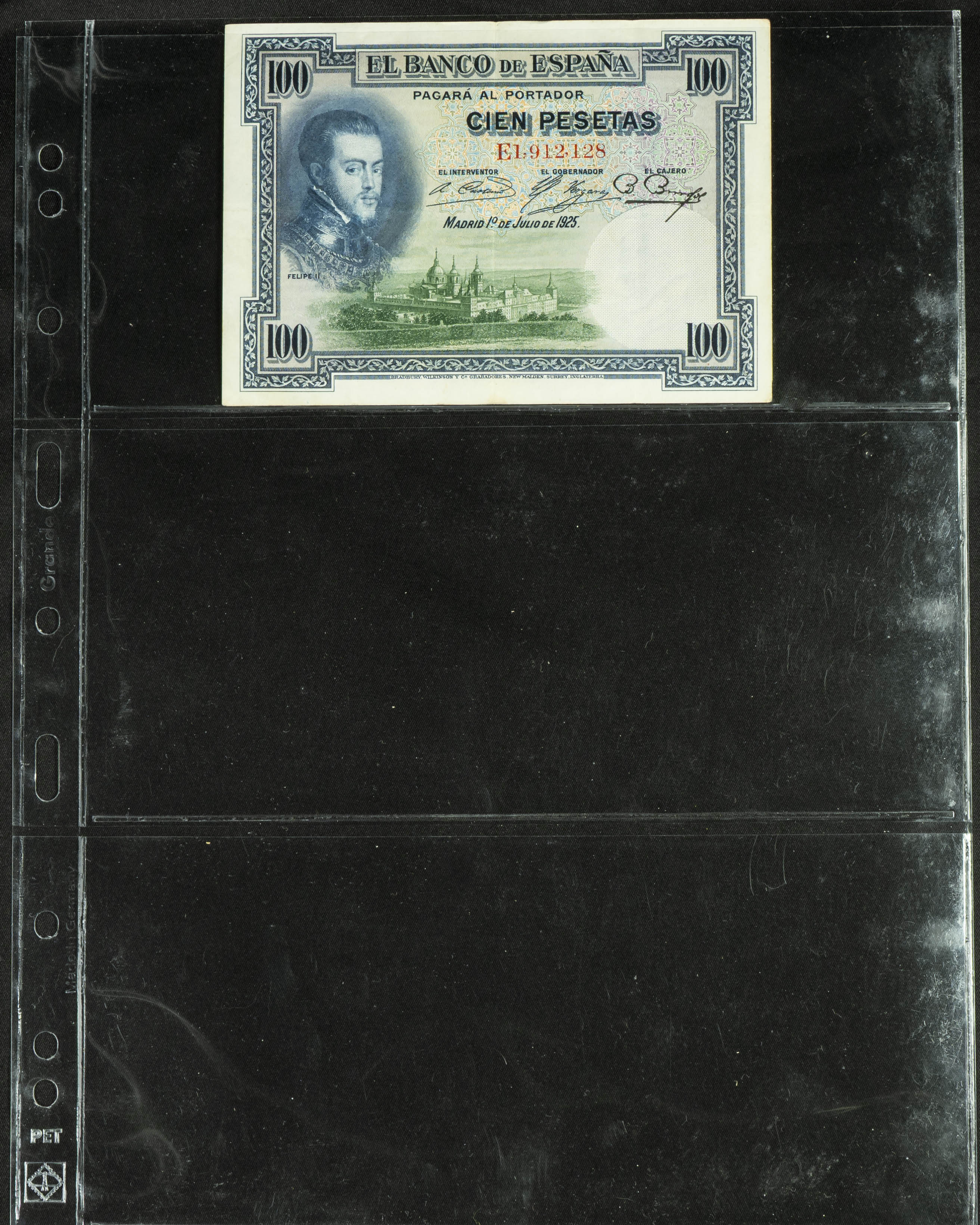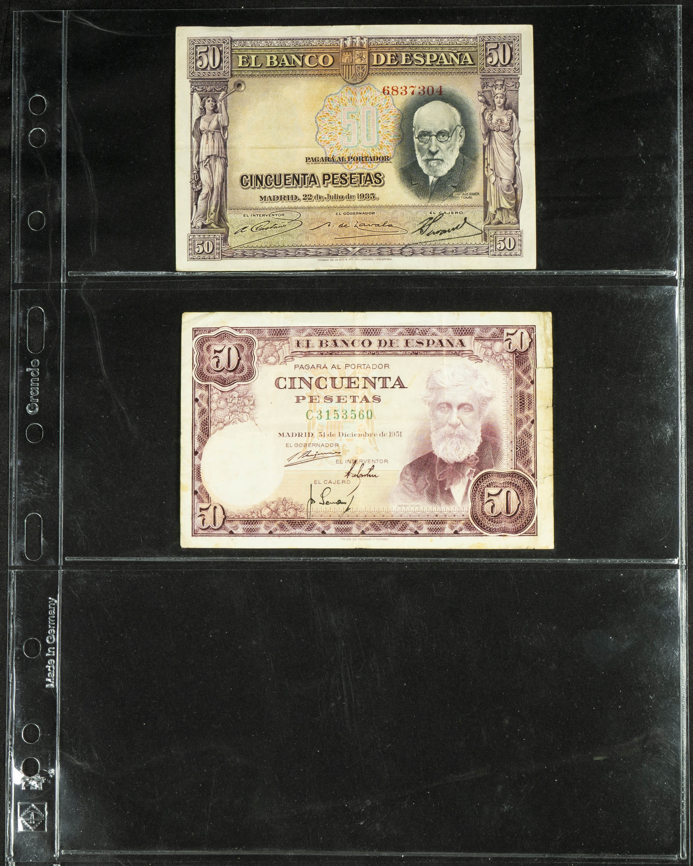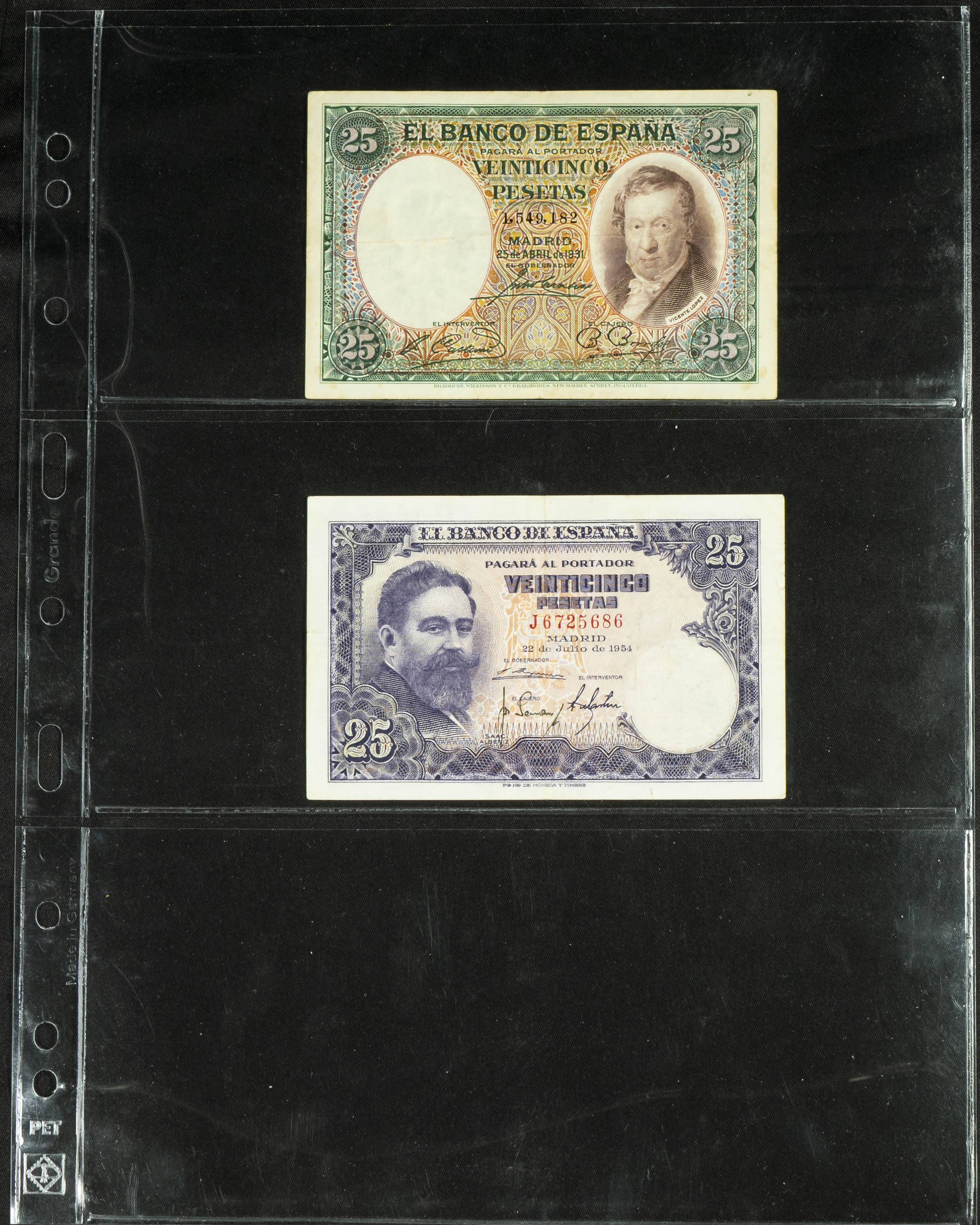 Interesante conjunto de más de 30 billetes del Banco de España de diferentes emisiones y en diversas calidades, incluyendo un billete de Cuba Colonial encapsulado por PMG. A EXAMINAR