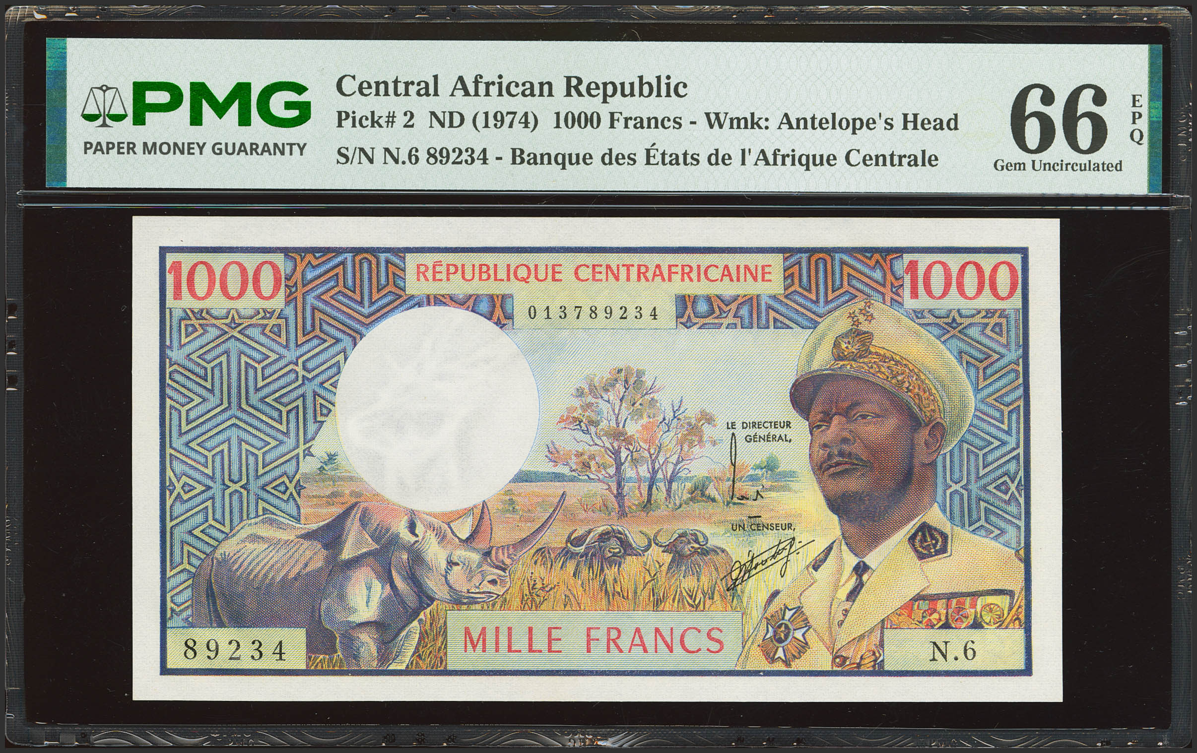 CENTRAL AFRICAN REPUBLIC. 1000 Francs. (1974ca). Banque des Etats de l'Afrique Centrale. (Pick: 2). PMG66EPQ.