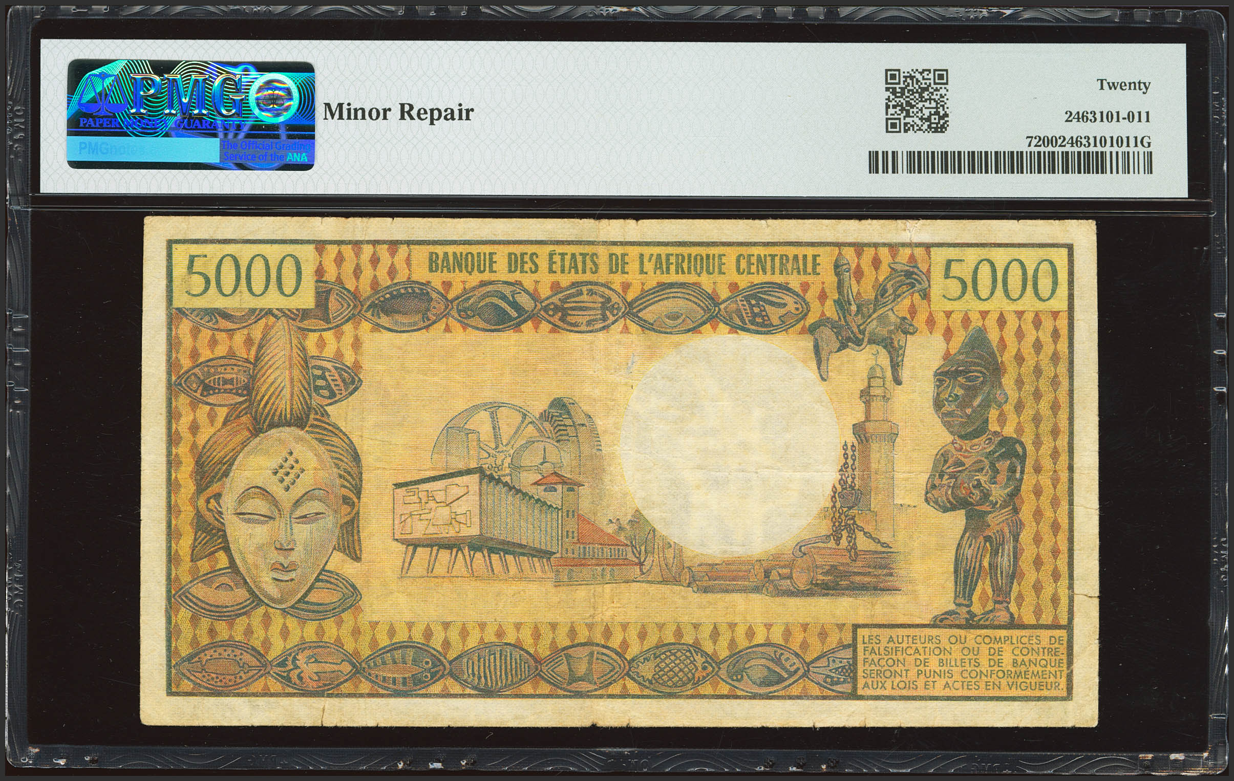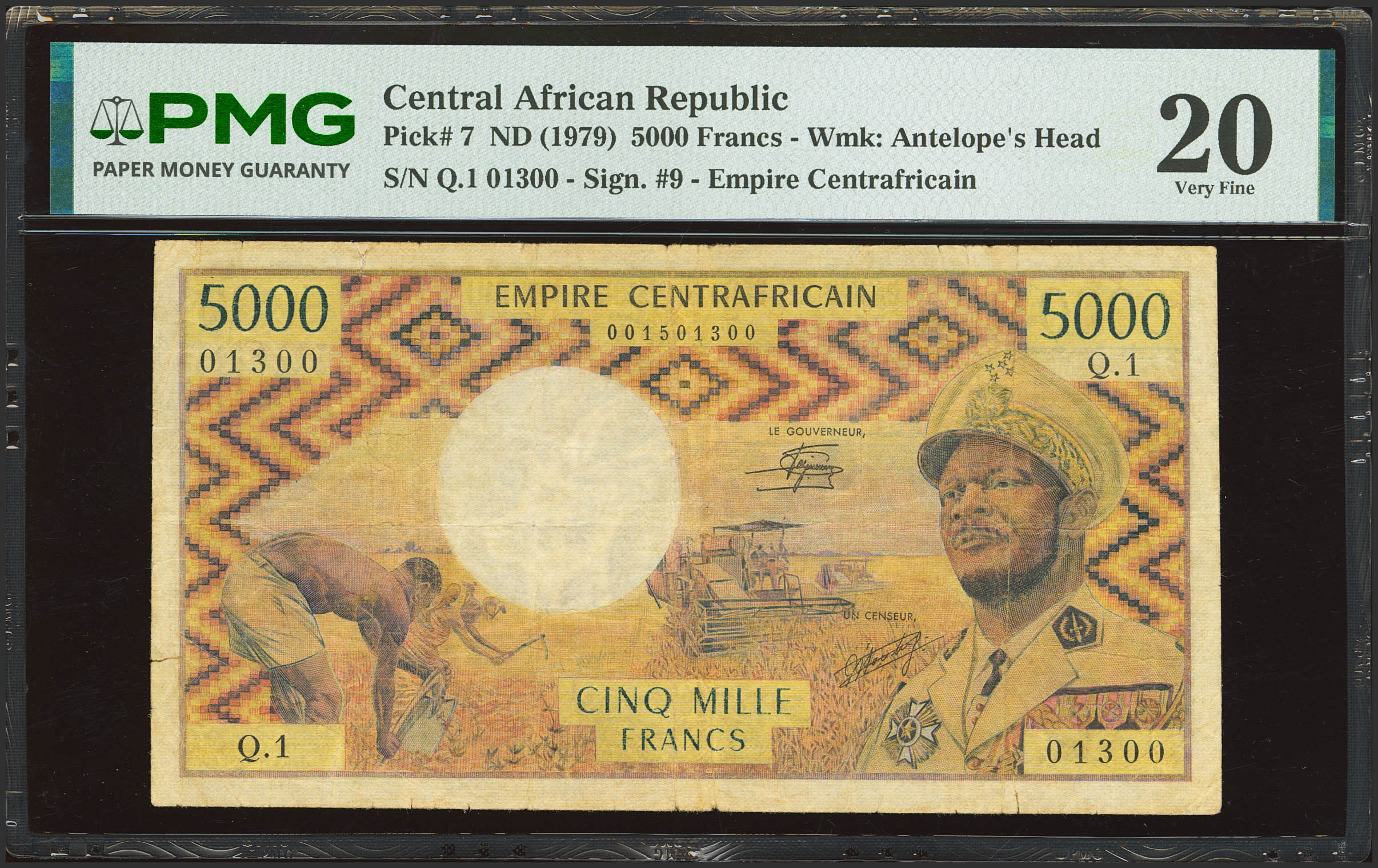 CENTRAL AFRICAN REPUBLIC. 5000 Francs. (1979ca). Banque des Etats de l'Afrique Centrale. Empire. (Pick: 7). PMG20 (minor repairs).