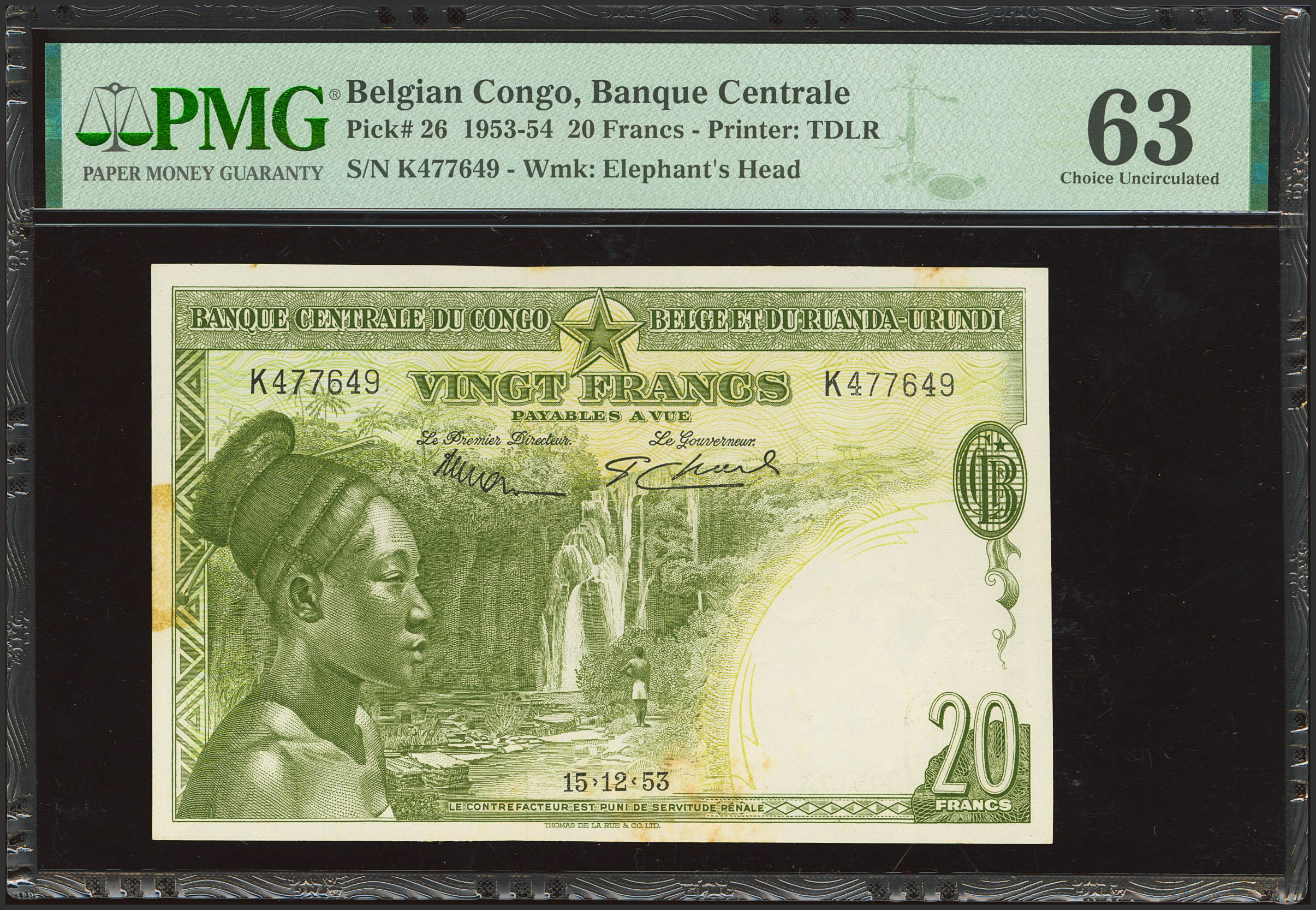 BELGIAN CONGO. 20 Francs. 15 December 1953. Banque Centrale du Congo Belge et du Ruanda-Urundi. (Pick: 26). PMG63 (foreign substance).
