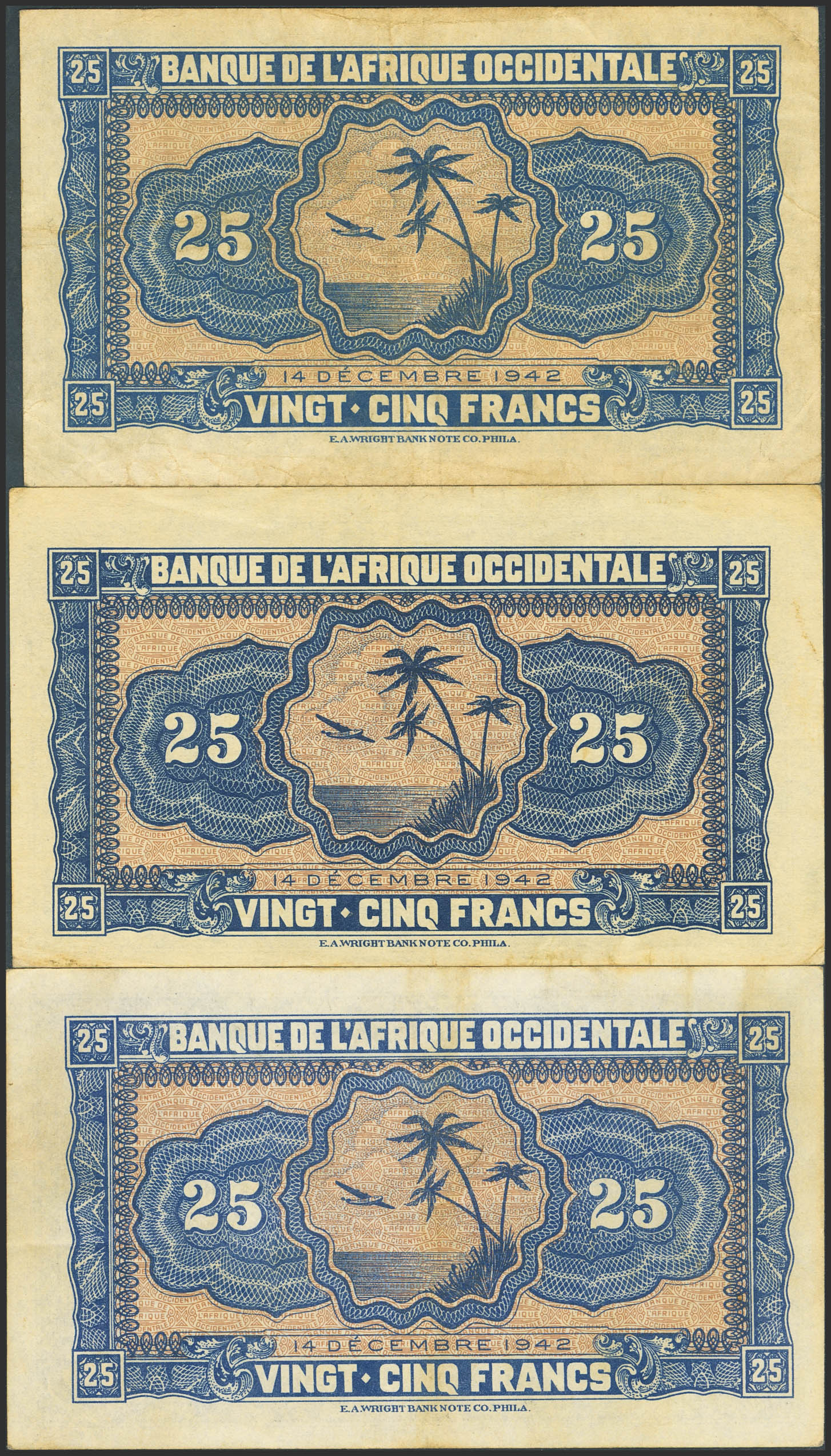 FRENCH WEST AFRICA. Lot of 3 notes of 25 Francs. 14 December 1942. Banque de l'Afrique Occidentale. (Pick: 30a). Almost Uncirculated, More than Very Fine and More than Extremely Fine.