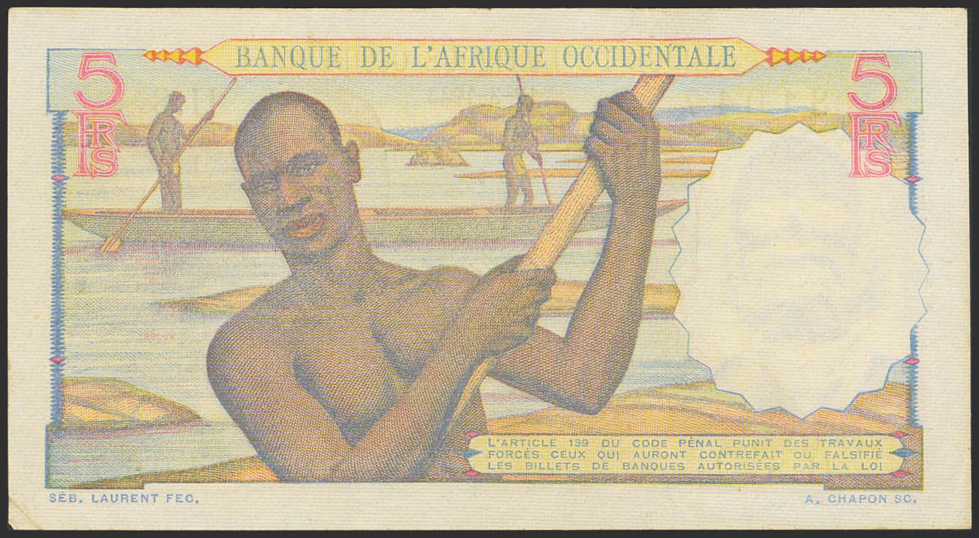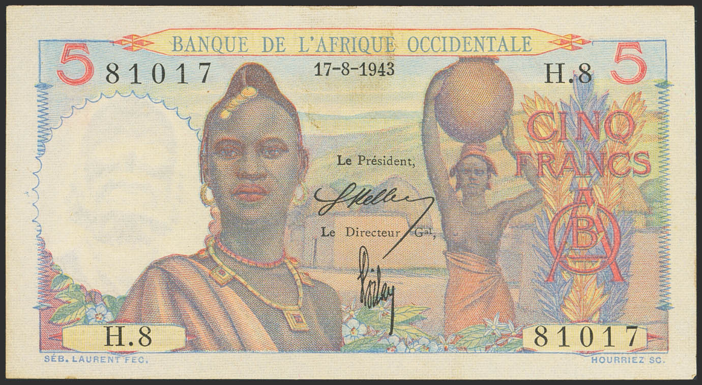 FRENCH WEST AFRICA. 5 Francs. 17 August 1943. Banque de l'Afrique Occidentale. (Pick: 36). Dirty. Almost Uncirculated.