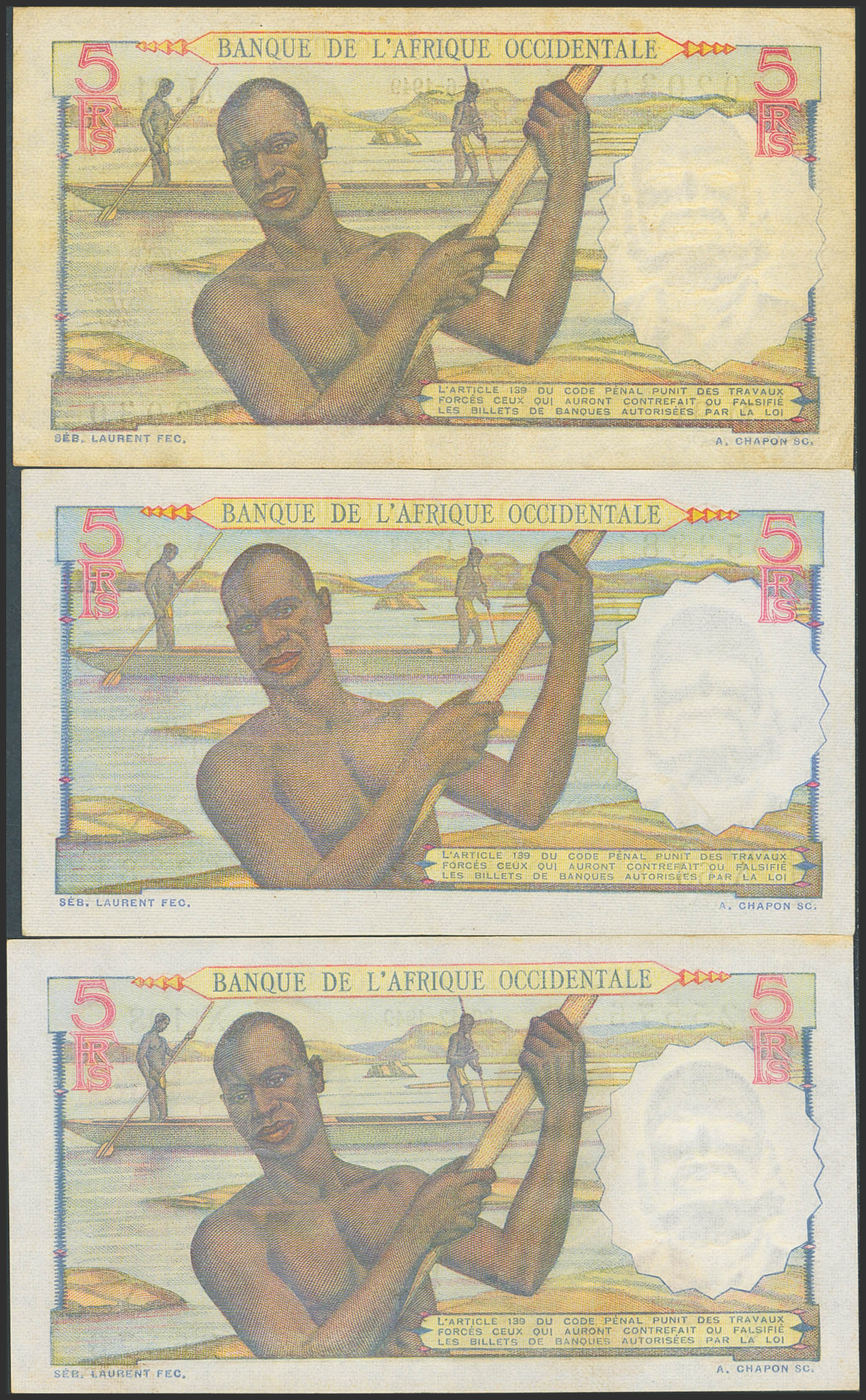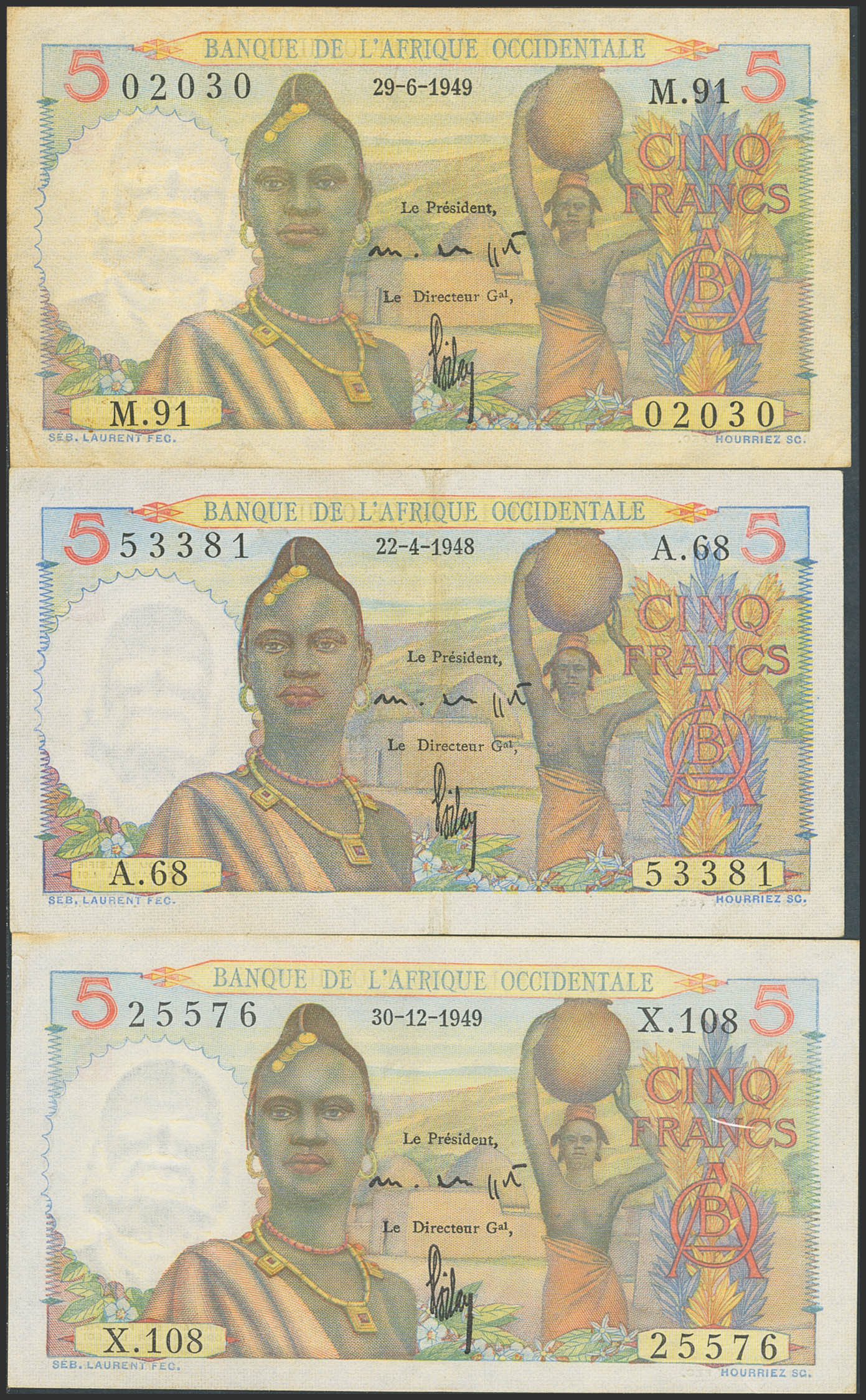FRENCH WEST AFRICA. Lot of 3 notes of 5 Francs. 1948 to 1949. Banque de l'Afrique Occidentale. (Pick: 36). More than Very Fine, Extremely Fine and Less than Uncirculated.