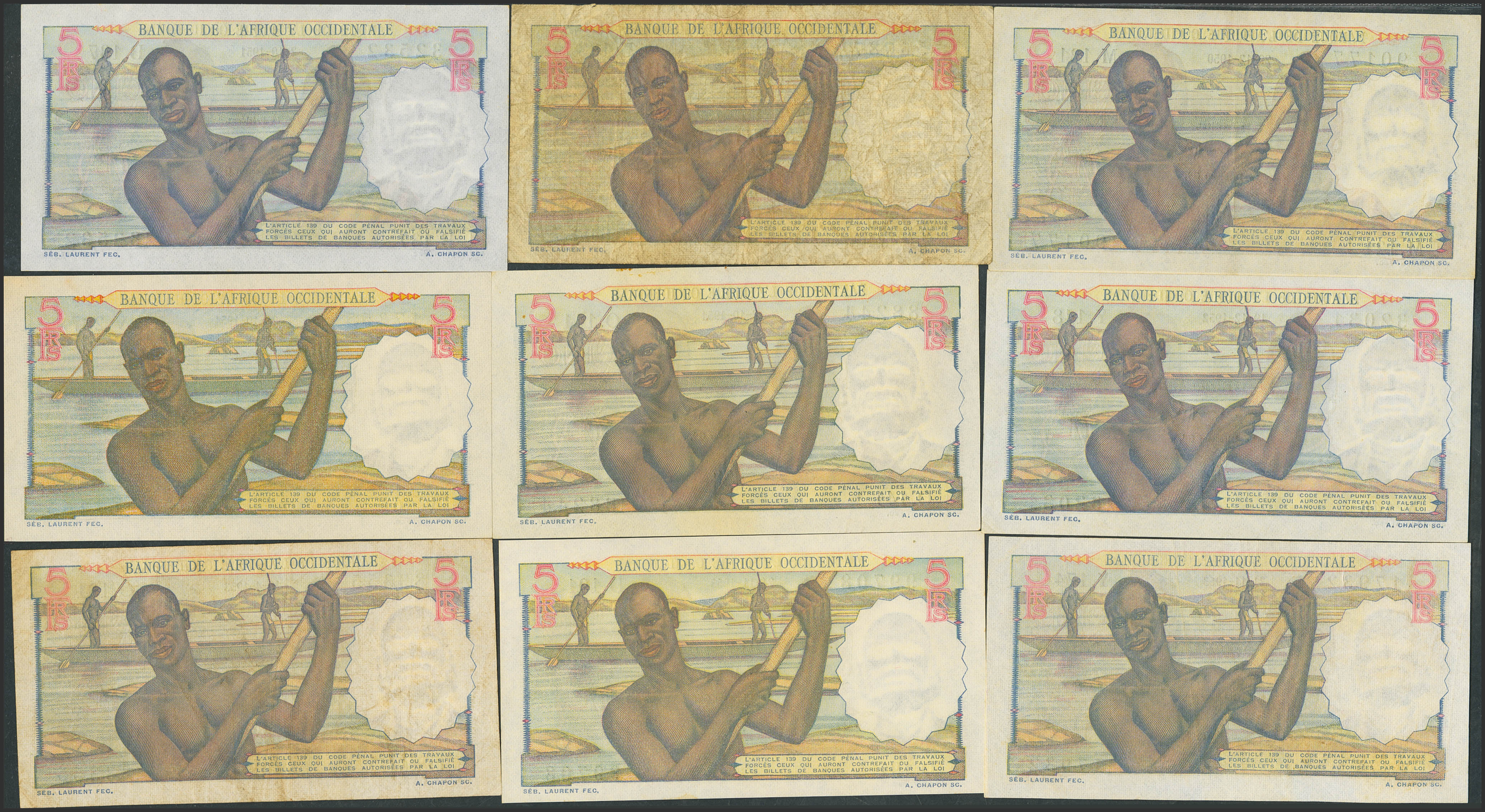 FRENCH WEST AFRICA. Lot of 9 notes of 5 Francs. 1950 to 1954. Banque de l'Afrique Occidentale. Mixed dates. (Pick: 36). Fine (1), Very Fine (2), Almost Uncirculated (1), Less than Uncirculated (3) and Uncirculated (2).