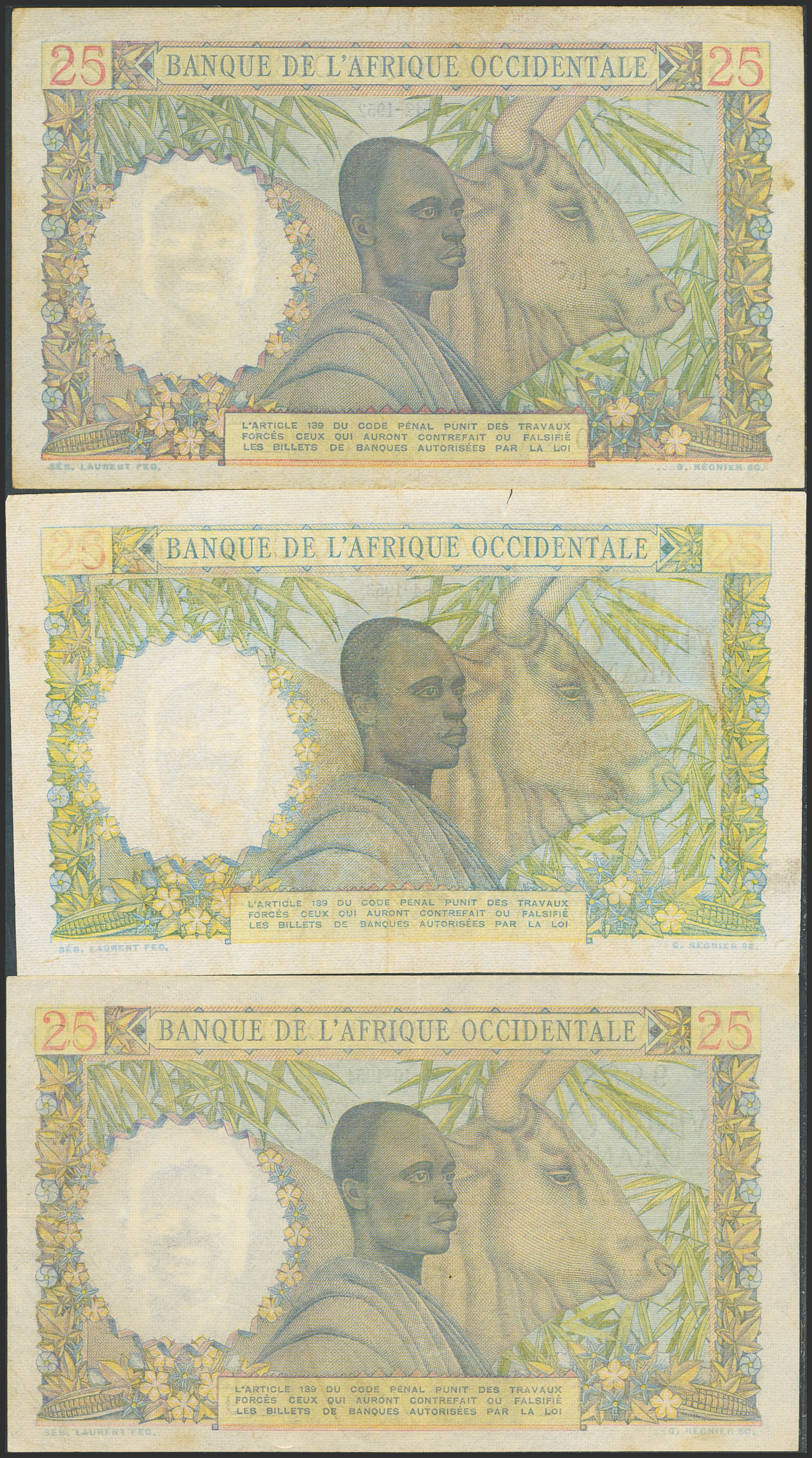 FRENCH WEST AFRICA. Lot of 3 notes of 25 Francs. 1952 to 1954. Banque de l'Afrique Occidentale. (Pick: 38). Extremely Fine (2) and More than Extremely Fine (1).