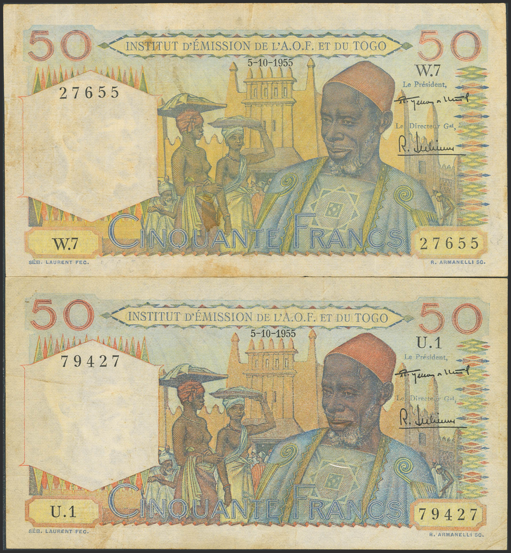 FRENCH WEST AFRICA. Lot of 2 notes of 50 Francs. 5 October 1955. Institut d'Emission de l'Afrique Occidentale Française et du Togo. (Pick: 44). Very Fine.
