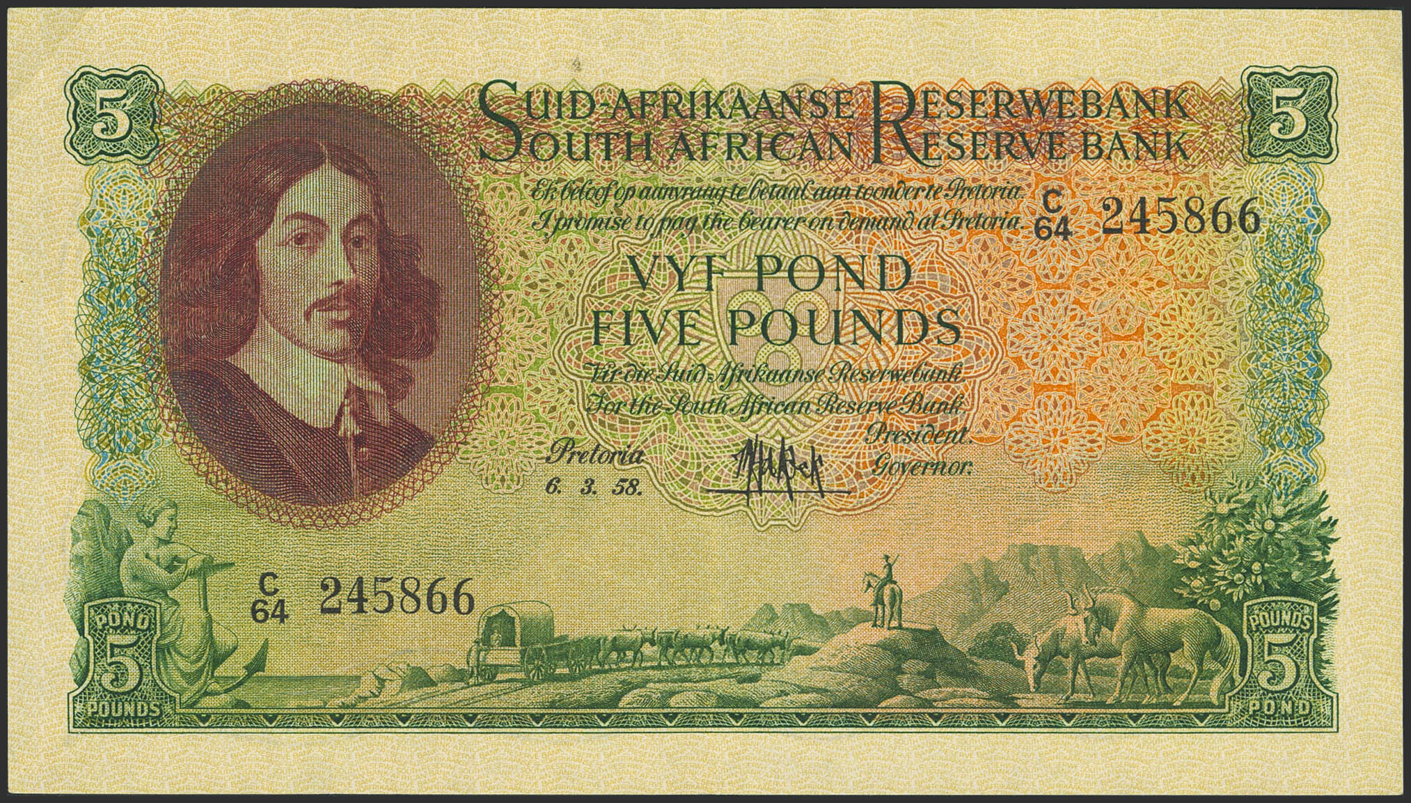 SOUTH AFRICA. 5 Pounds. 6 March 1958. Reserve Bank. (Pick: 97c). More than Extremely Fine.