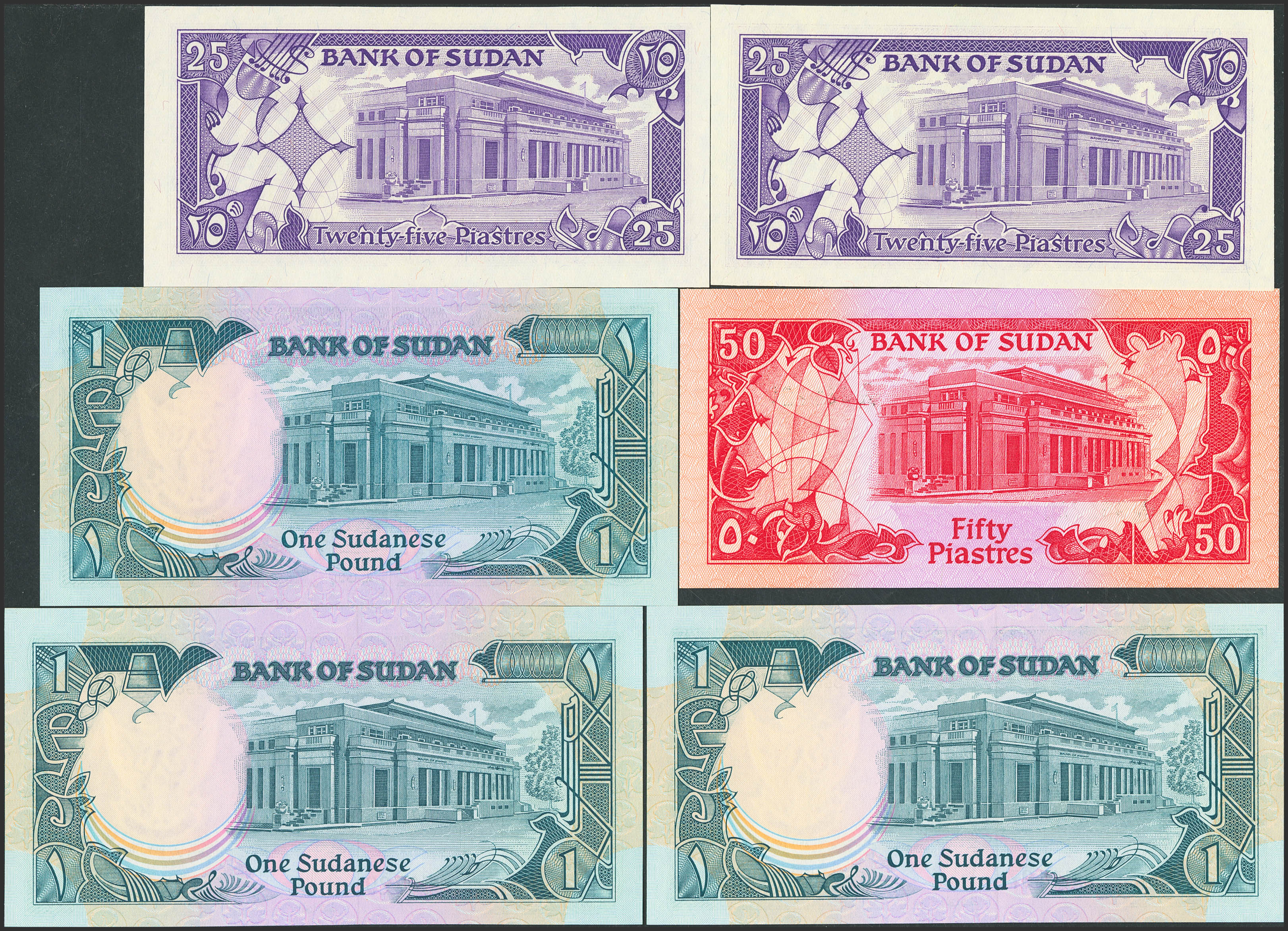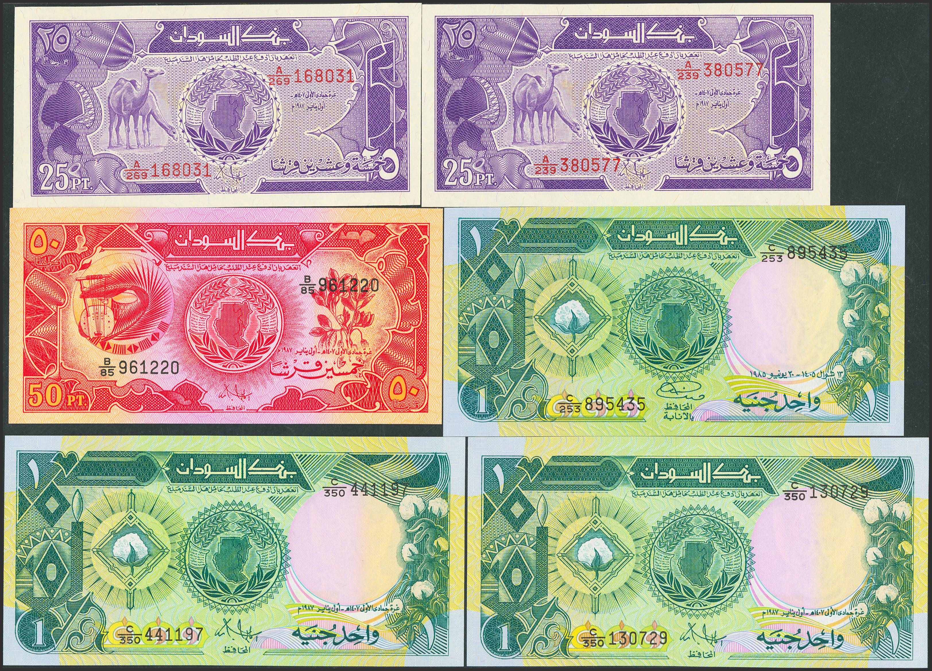 SUDAN. Lot of 6 notes from 25 Piastres to 1 Sudanese Pound. 1985 and 1987. Bank of Sudan. (Pick: 32, 37(2), 38, 39(2)). Uncirculated.