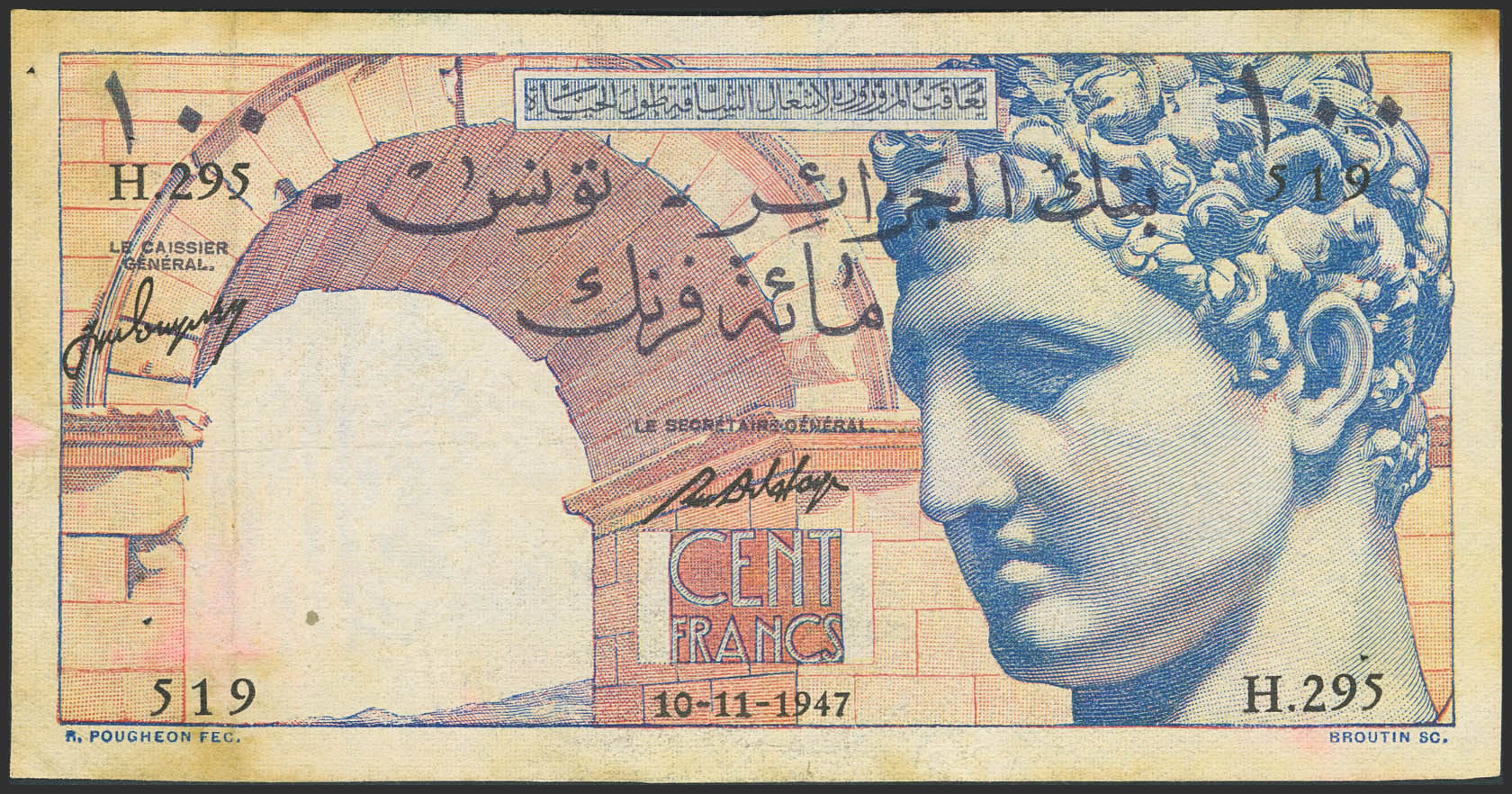 TUNISIA. 100 Francs. 10 November 1947. Banque de l'Algerie. Tunisie. (Pick: 24). Pinholes. Very Fine.