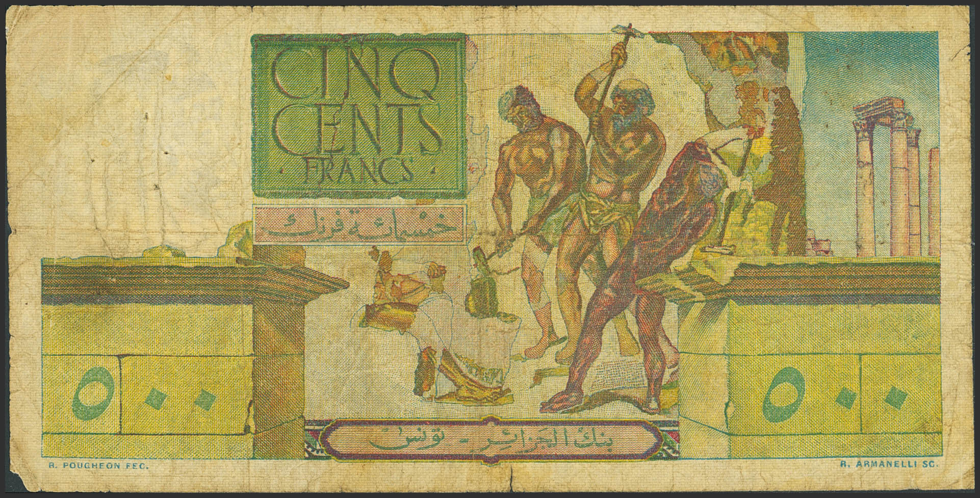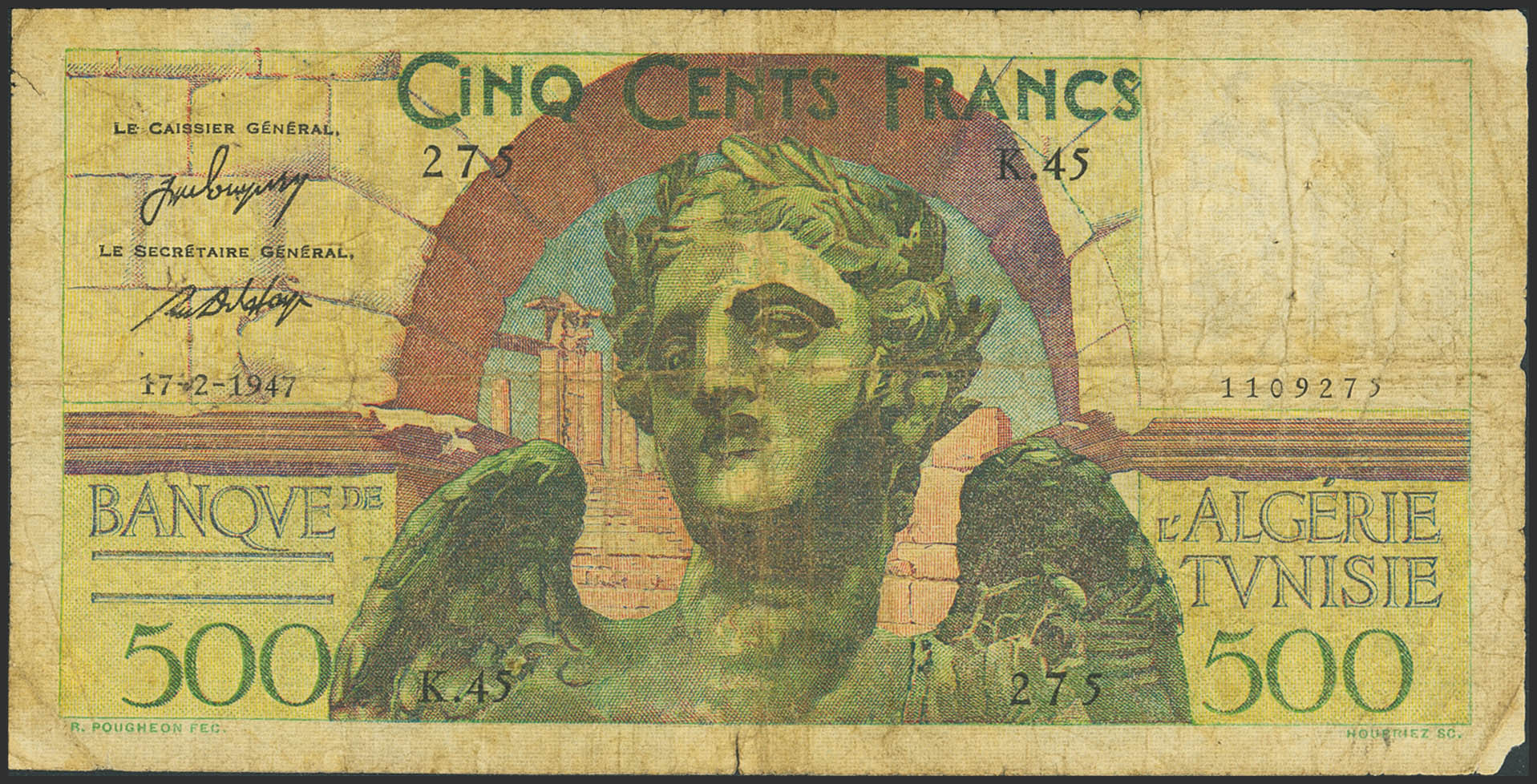 TUNISIA. 500 Francs. 17 February 1947. Banque de l'Algerie. Tunisie. (Pick: 25). Flattened, corner missing and pinholes. Fine.