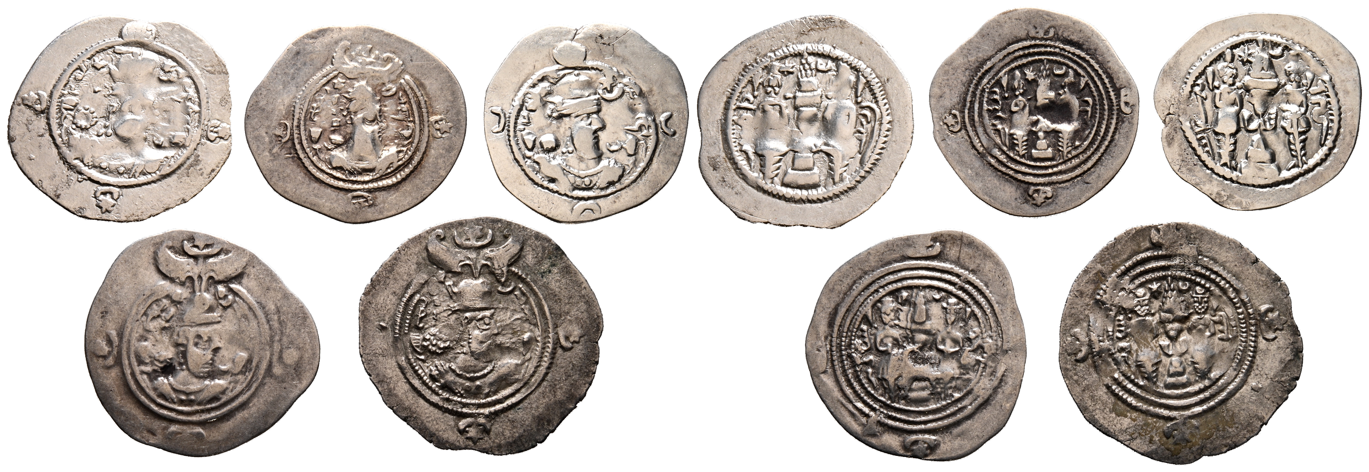 IMPERIO SASANIDA. Interesante conjunto formado por 5 dracmas a nombre de Khusro I y Khusro II. Diferentes cecas, medidas y estados de conservación. A EXAMINAR.