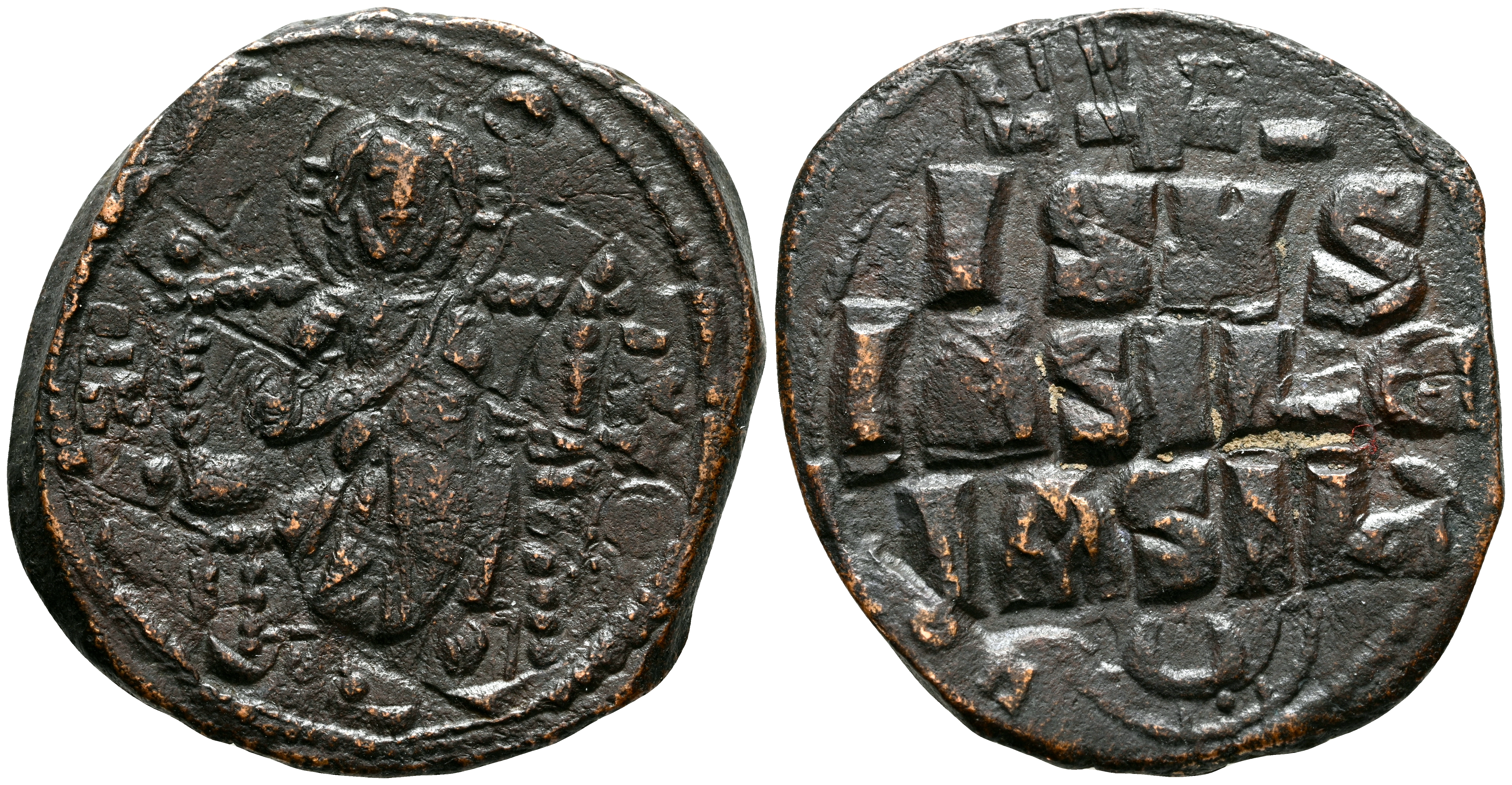 ANONIMO, atribuído a Constantino IX Monómaco (1042-1055). Follis. (Ae. 9,46g/29mm) 1045-1055 d.C. Constantinopla. (Seaby 1836). Anv: Cristo de frente entronizado sosteniendo Evangelio, a los lados IC-XC. Rev: Leyenda bizantina en tres líneas: ISHS/bA SILE/bASIL, cruz arriba y creciente debajo. MBC.