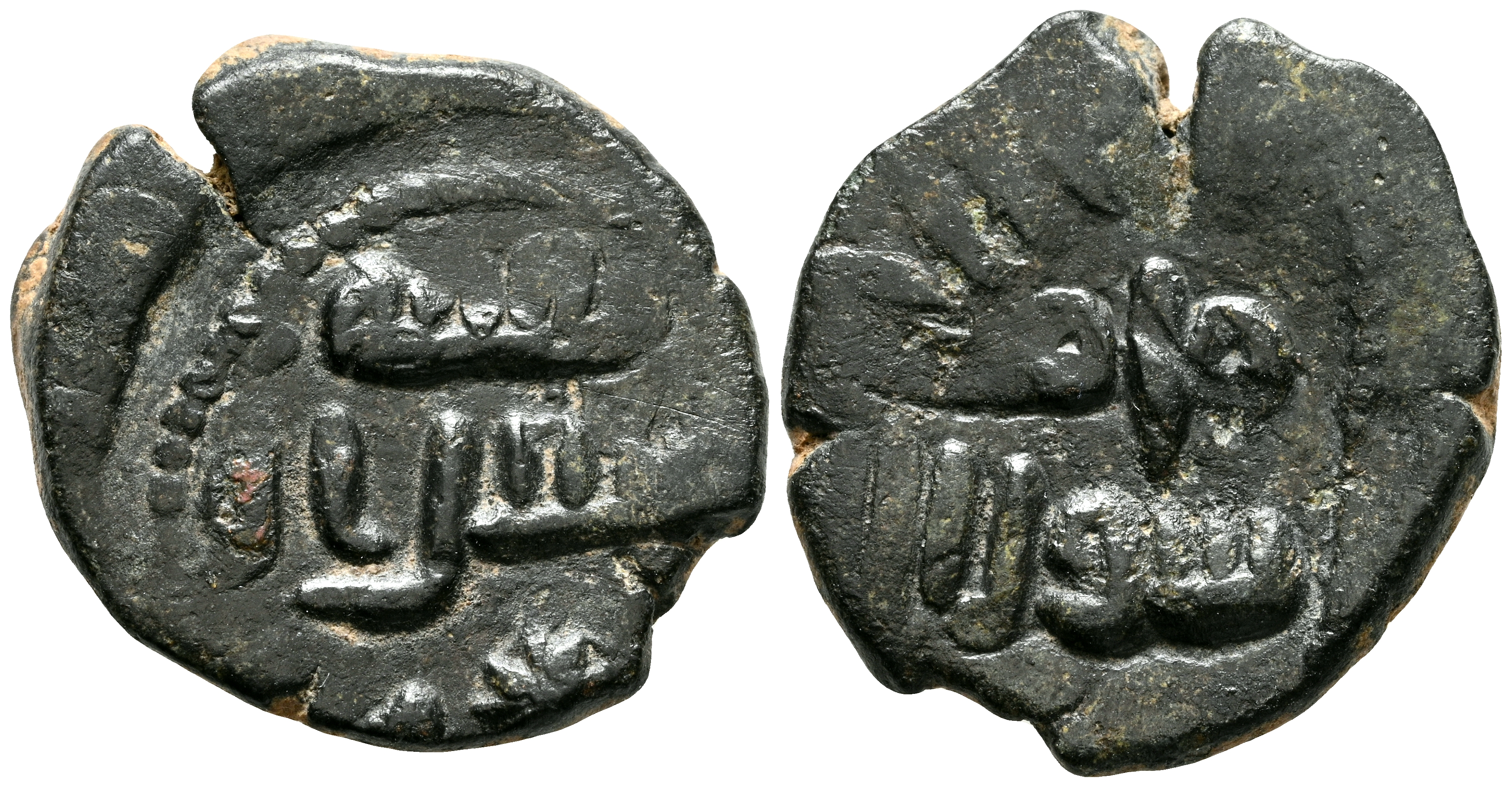 EMIRATO DEPENDIENTE DE CORDOBA, PERIODO DE GOBERNADORES. Anónimo. Felús. (Ar. 4,04g/20mm). S/D. (Frochoso II-a/XI-a). Anv: نفقة (Se contribuye), sobre: لااله ا. Rev: سول الله / محمدر (Muhammad enviado de Dios). MBC. Raro ejemplar.