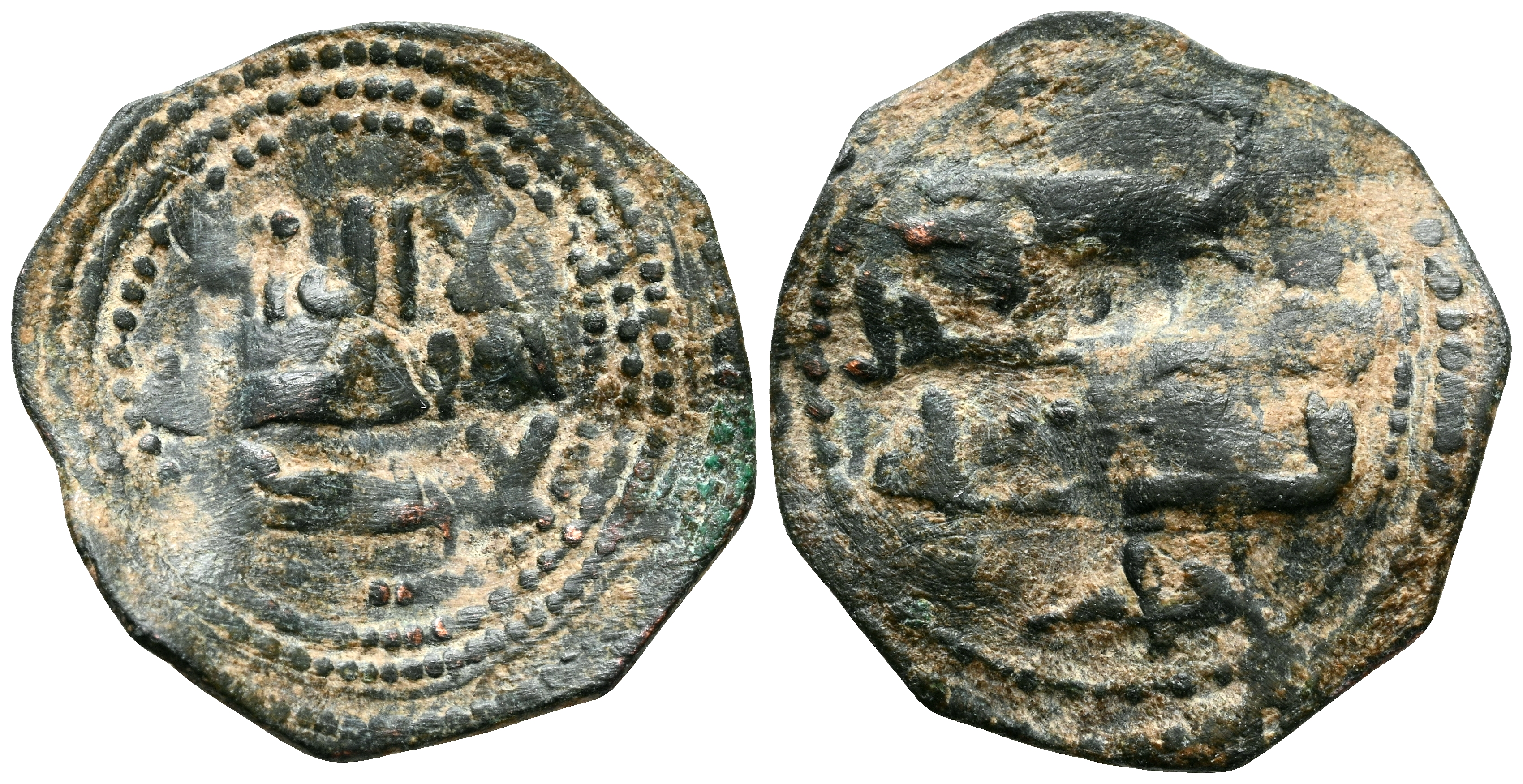 EMIRATO INDEPENDIENTE DE CÓRDOBA. Felús. (Ae. 1,00g/17mm). S/D. (Frochoso l-57-3). Leyendas religiosas dividas en tres líneas en ambas áreas. Citando a حلف (Jalaf) en IIA. MBC. Alabeada. Escaso ejemplar.