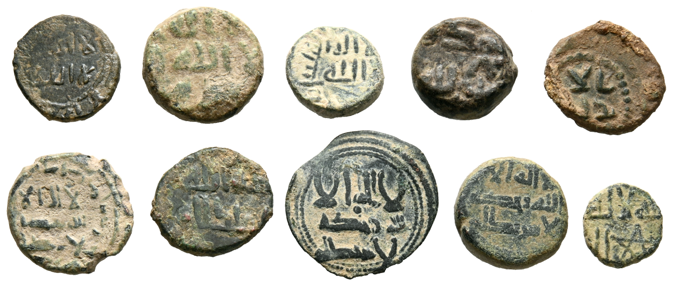 Interantísimo conjunto formado por 10 féluses correspondientes al periodo de gobernadores y emirado independiente. Todos de diferentes tipologías, incluyendo los tipos Frochoso XVII y XVIII, con ceca al-Ándalus / الاندلس. Diferentes módulos, pesos y estados de conservación. A EXAMINAR.
