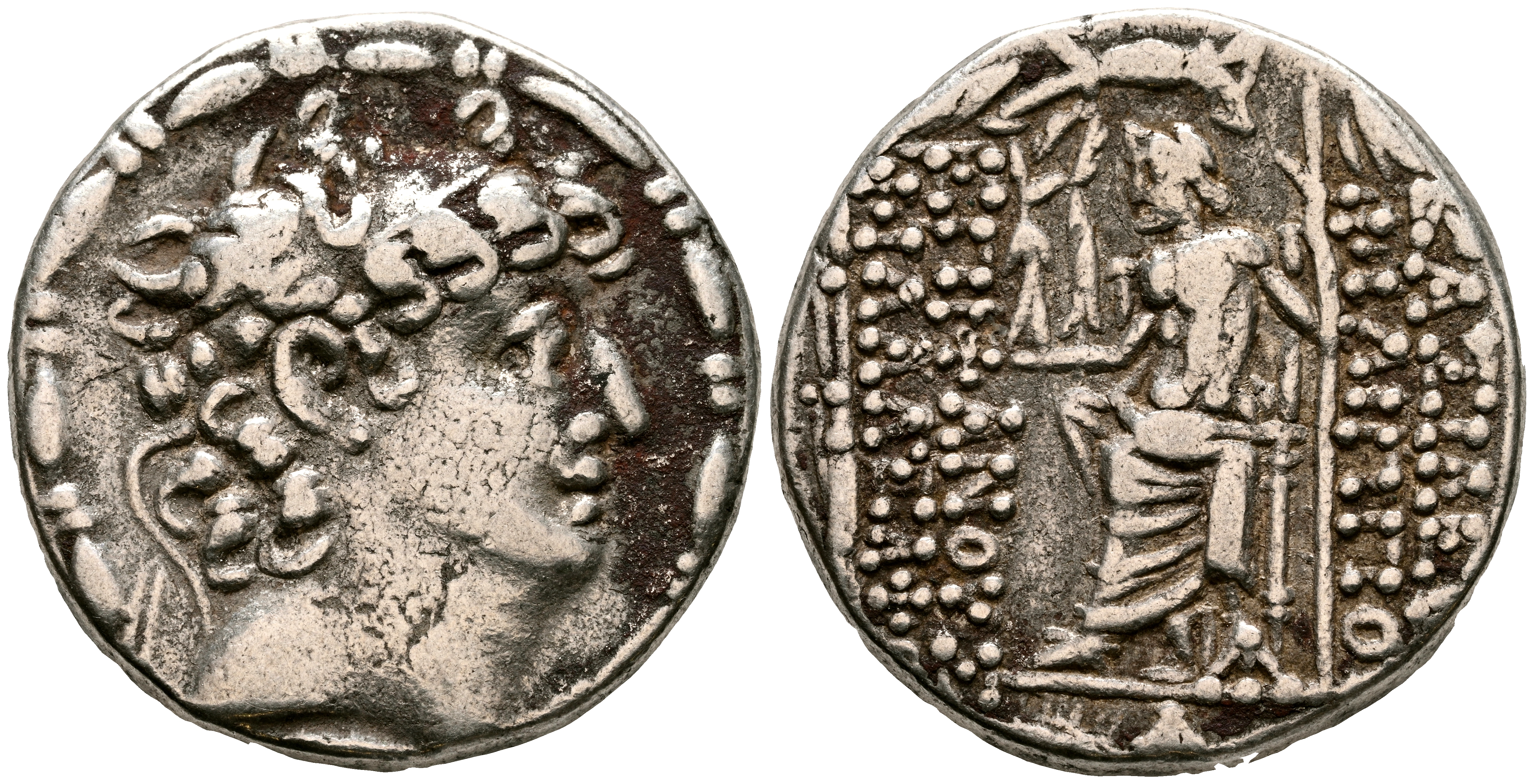 REINO SELEUCIDA, Filipo I Filadelfos. Tetradracma. (Ar. 15,06g/26mm). 93-83 a.C. Antioquía. (HGC 9, 1320). Anv: Cabeza laureada de Filipo I a derecha. Rev: Zeus sentado a izquierda portando cetro y Nike con corona de laurel, delante monograma: AP, al rededor leyenda griega: ΒΑΣΙΛΕΩΣ ΦΙΛΙΠΠΟY ΕΠΙΦΑΝΟYΣ ΦΙΛΑΔΕΛΦOY. MBC-.