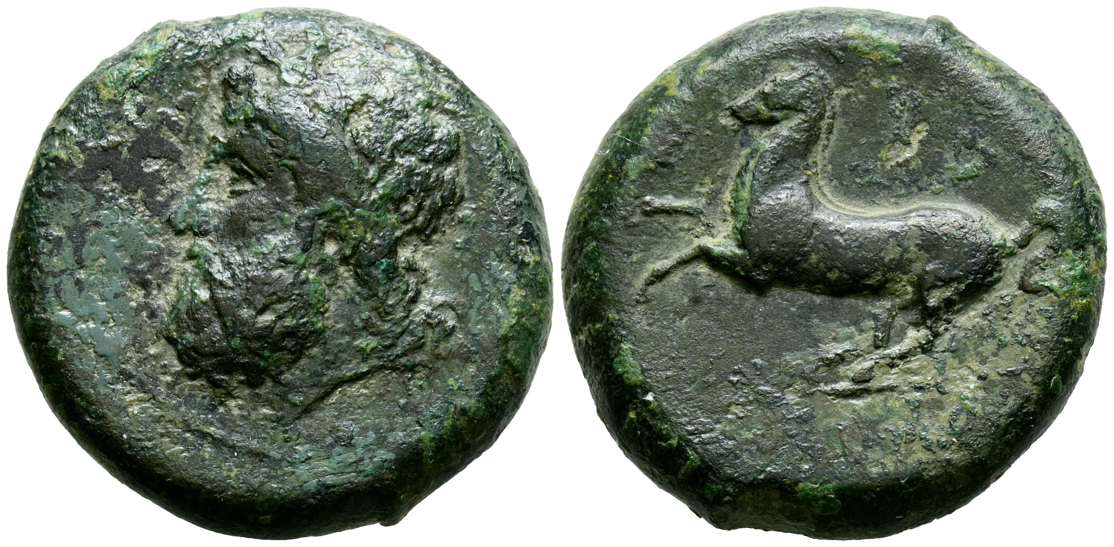 SICILIA, Siracusa. Timoleón y la Tercera Democracia (344-317 a.C.). Dilitron. (Ae. 19,89g/27mm). Acuñación de la Simmachía Timoleóntica. 2ª serie, hacia 339/8-334 a.C. (HGC 6, 1439). Anv: Cabeza laureada de Zeus Eleuterio a la izquierda, alrededor le yenda: ZEYΣ EΛEYΘPIOΣ. Rev: Caballo saltando a izquierda, en exergo: ΣYPAKOΣIΩN. MBC.