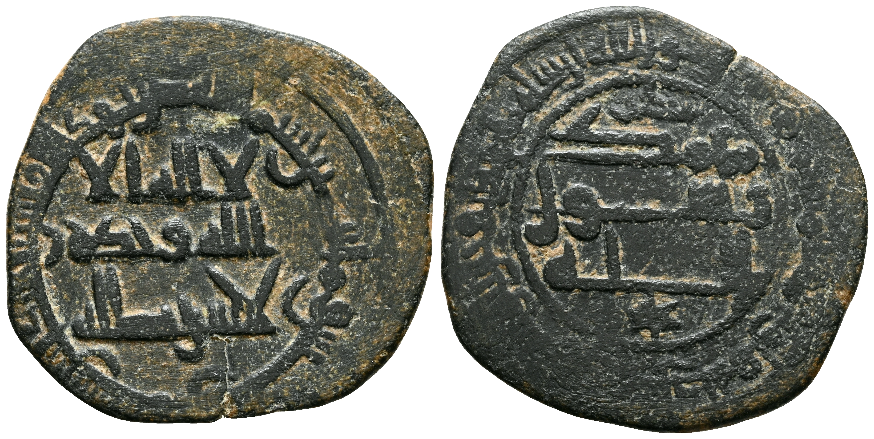 EMIRATO INDEPENDIENTE DE CÓRDOBA. Atribuído a Muhammad I. Felús. (A.1,76g/20mm). 268H. al-Ándalus /الاندلس. (Vives 315; Miles 161 l; Frochoso I-21). Variante con nombre ¿بكر/Bakr? en IIA. MBC. Escaso ejemplar.