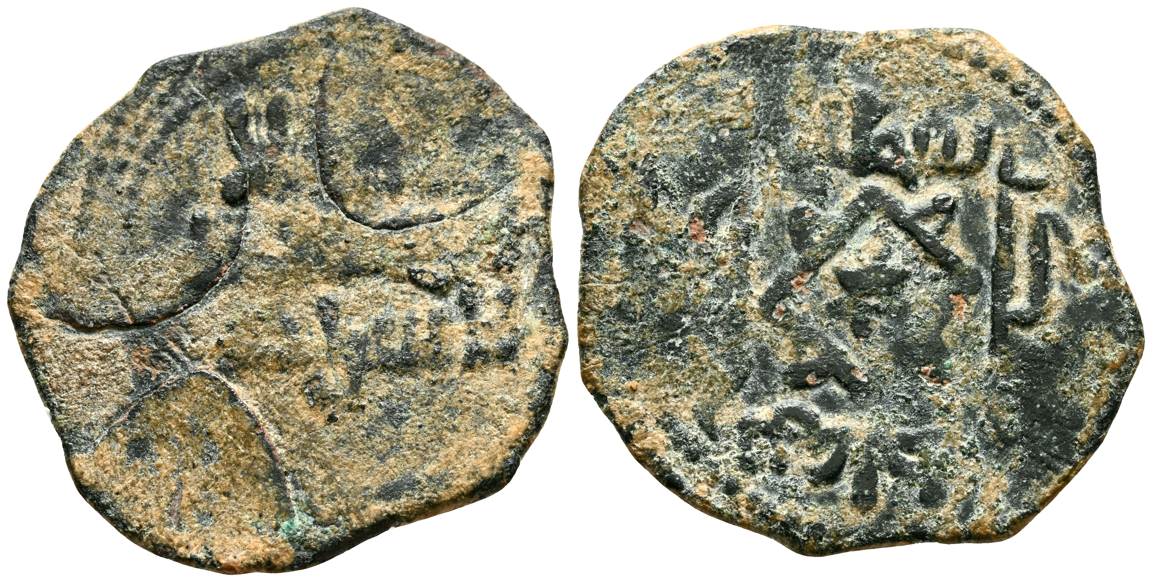 EMIRATO INDEPENDIENTE DE CÓRDOBA, atribuída a Abd Allah (275-300H). Felús. (Ae. 1,92g/21mm). S/D. (Vives 333; Frochoso I-72). Anv: 'Sahada' en tres líneas rodeada de triple gráfila circular de puntos. Rev: Sello de Salomón, alrededor leyenda en cuadr ado con la misión profética de Muhammad / محمد رسول الله y citando a Husain Ibn Isam / حسين بن عاصم. BC+/MBC-. Raro ejemplar.
