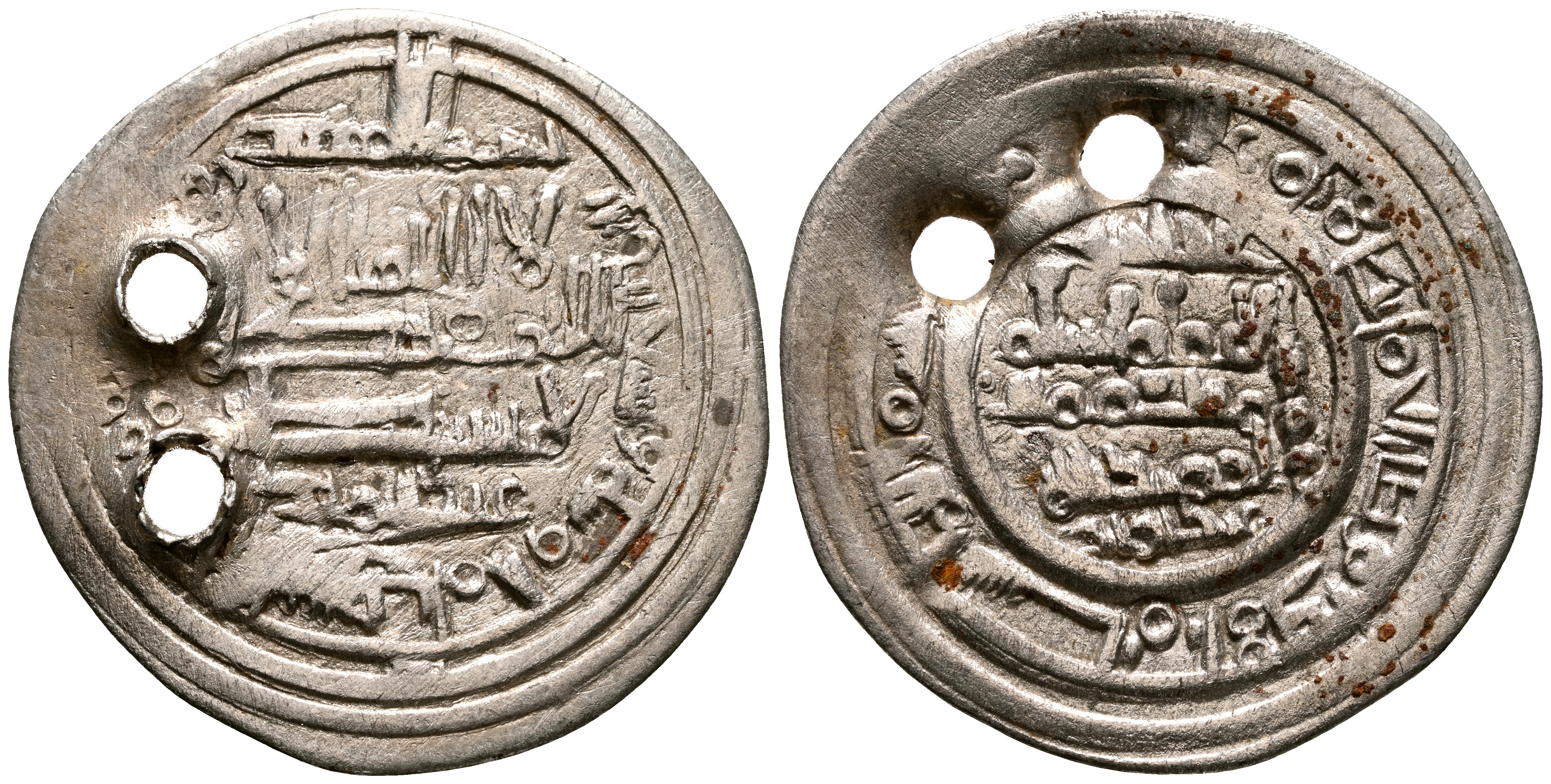 CALIFATO DE CORDOBA, Hisham II. Dirham falso de época. (Ve. 2,16g/23mm). 395H. al-Ándalus / الاندلس. (Vives tipo 581). Citando a 'Abd al-Malik / عبد الملك en IA. y al-Hāŷib 'Abd al-Malik / عبد الملك / الحاجب en IIA. MBC-. Dos perforaciones.
