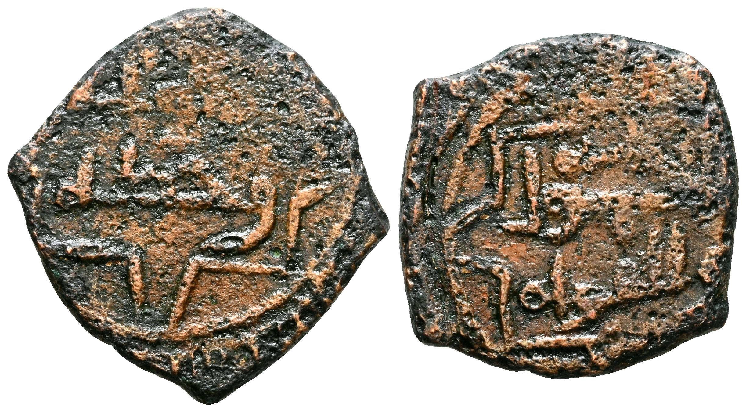 TAIFAS DEL CALIFATO, Anónimo atribuído a Toledo. Fracción de Cobre. (Ae. 0,99g/13mm). S/D. (Agüera 2017 var; Manquso nº8, pp. 43-60). Anv: وحده / لا اله الا الله . Rev: و القوة / الحول / لله (para Dios el poder y la fuerza). MBC-. Rarísimo ejemplar. No tenemos costancia de ningun otro ejemplar con esta variante de leyenda en reverso. Como una variante de Ibrahim, Cantó (2003), Suplemento a los Reinos de Taifas, n.º 169, esta pieza pertenece a la serie de piezas anónimas con exagrama que Codera a tribuyó a Almería «por tener alguna semejanza con algunos ejemplares del n.º 1047 de Vives, aunque en el tesorillo donde aparecieron aquellos ejemplares también se contenían otros diferentes de las taifas de Toledo, Badajoz, Córdoba, Valencia, Dénia y Zaragoza». Sin embargo, precediendo la intuición del doctor Albert Cantó, sería David Francés quien aportaría un razonamiento más lógico sobre su origen en su libro De la legitimidad, las sucesiones y su reflejo en las acuñaciones andalusíes (pp. 137-139), justificando la atribución de esta pieza a Toledo durante la presencia de ʿUmar al-Mutawakkil, rey de Badajoz. https://wearenumismatics.com/wp-content/uploads/2023/04/Manquso08.pdf