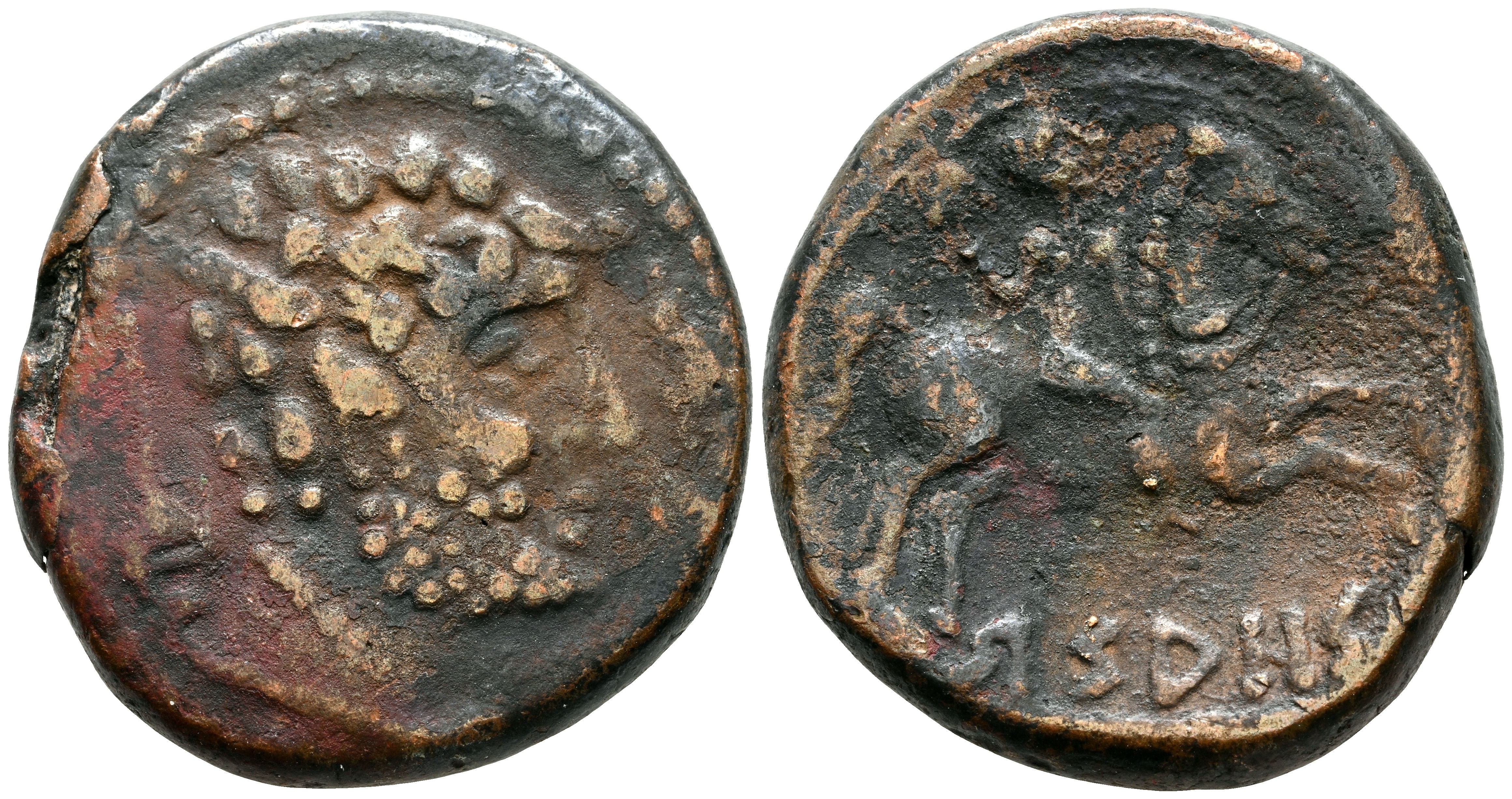 ARSAOS (Area de Navarra). As. (Ae. 12,05g/25mm). 120-80 a.C. (FAB-144). Anv: Cabeza masculina barbada a derecha, entre dos delfines. Rev: Jinete con dardo a derecha, debajo leyenda ibérica: ARSAOS. MBC-. Limpiado.