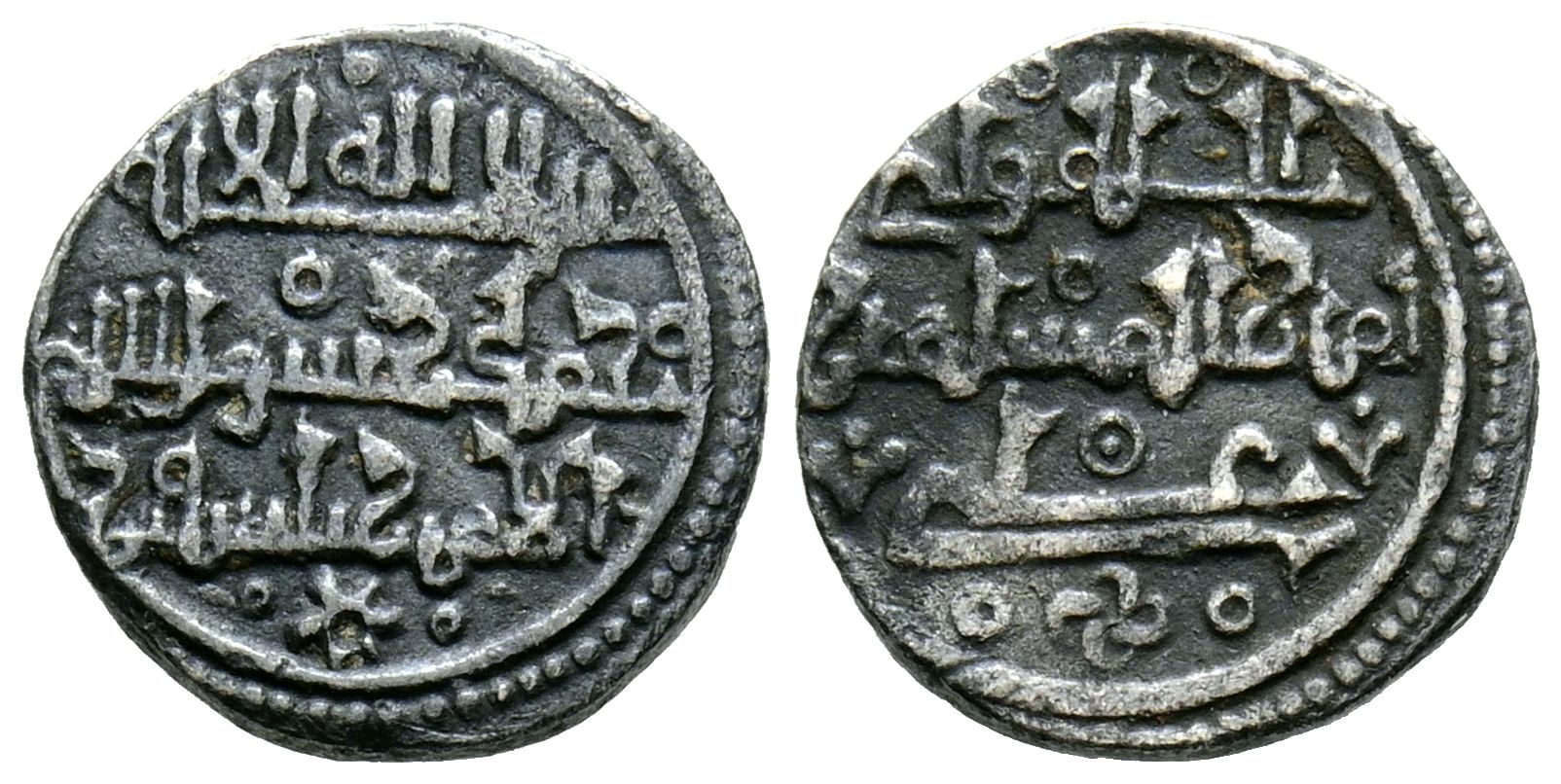 ALMORAVIDES, 'Ali ben Yusuf y el emir Tahsfin (533-537H). Quirate. (Ar. 0,91/11mm). (Vives 1820; Hazard 997; Benito Ch13). Anv: 'Shahada' en tres líneas y mención al heredero. Rev: Presenta a Ali con título de Amir al-Muslimin, arriba la expresión: A llah Wali / الله ولي (Dios ''es el'' guardián). MBC.