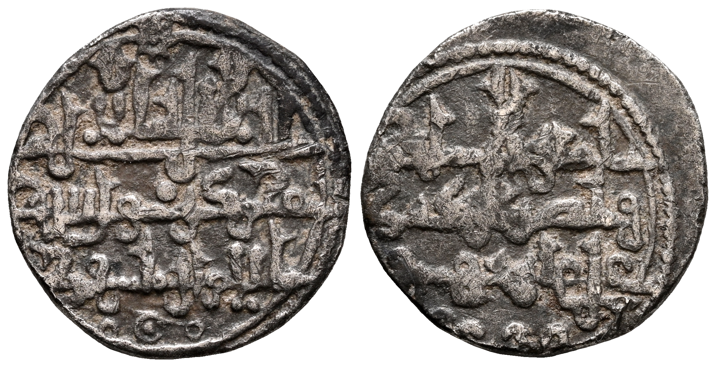ALMORÁVIDES, Ali ben Yusuf con Tashfin como heredero (533-537H). Quirate. (Ar. 0,91g/12mm). S/D. (Vives 1824; Medina 139; Benito Cj3). Anv: 'Shahada' en tres líneas y mención al heredero. Rev: Presenta a Ali con títulos de Amir al-Muslimin y Nasir al-Din. (Variante decorada con los remates de las letras altas astados). MBC/MBC-.