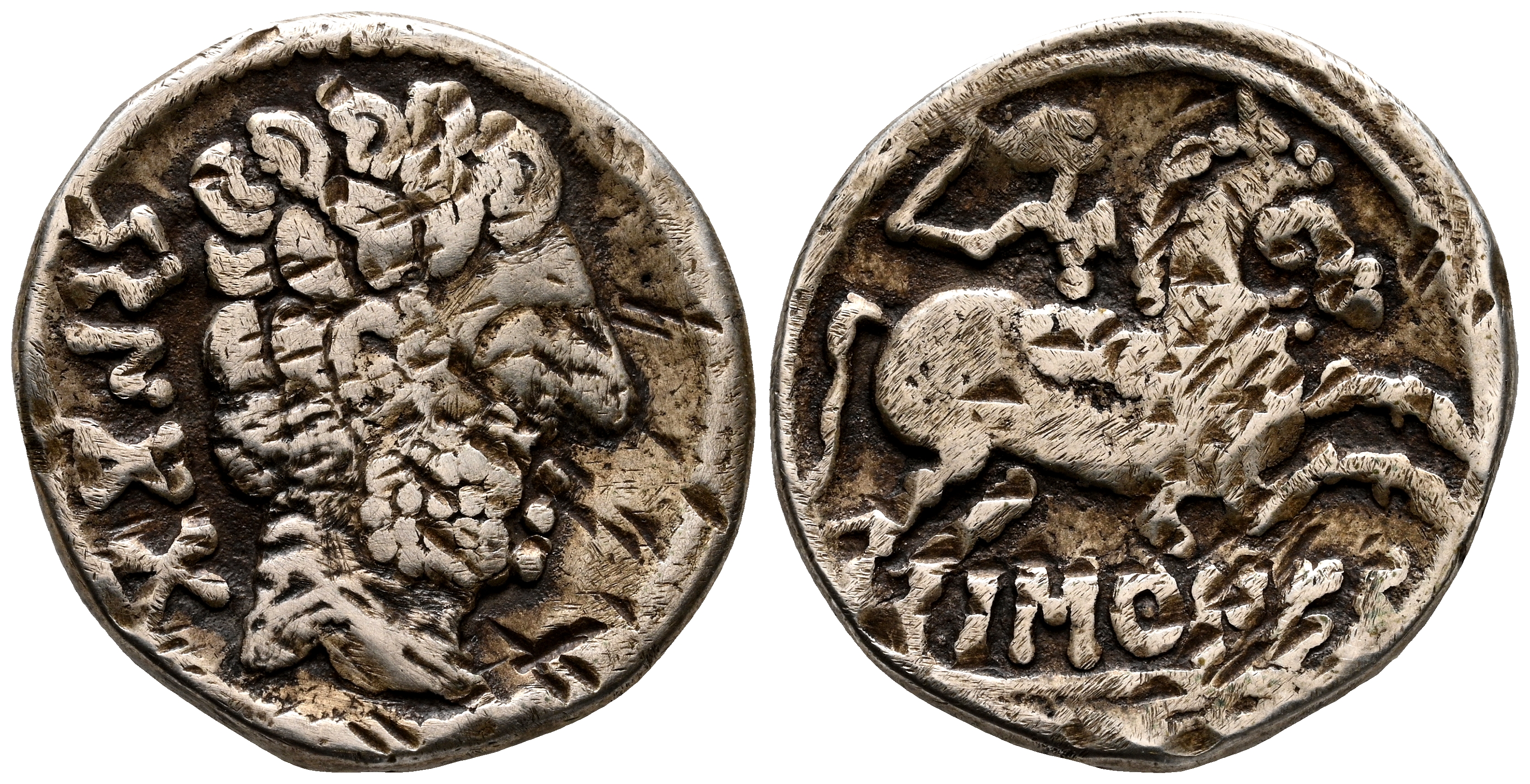 BASCUNES (Pamplona). Denario. (Ar. 3,61g/17mm). 120-20 a.C. (FAB-215). Anv: Cabeza masculina barbada a derecha, detrás leyenda ibérica: BeNCoDa. Rev: Jinete con espada a derecha, debajo leyenda ibérica: BaSCuNES. BC+.