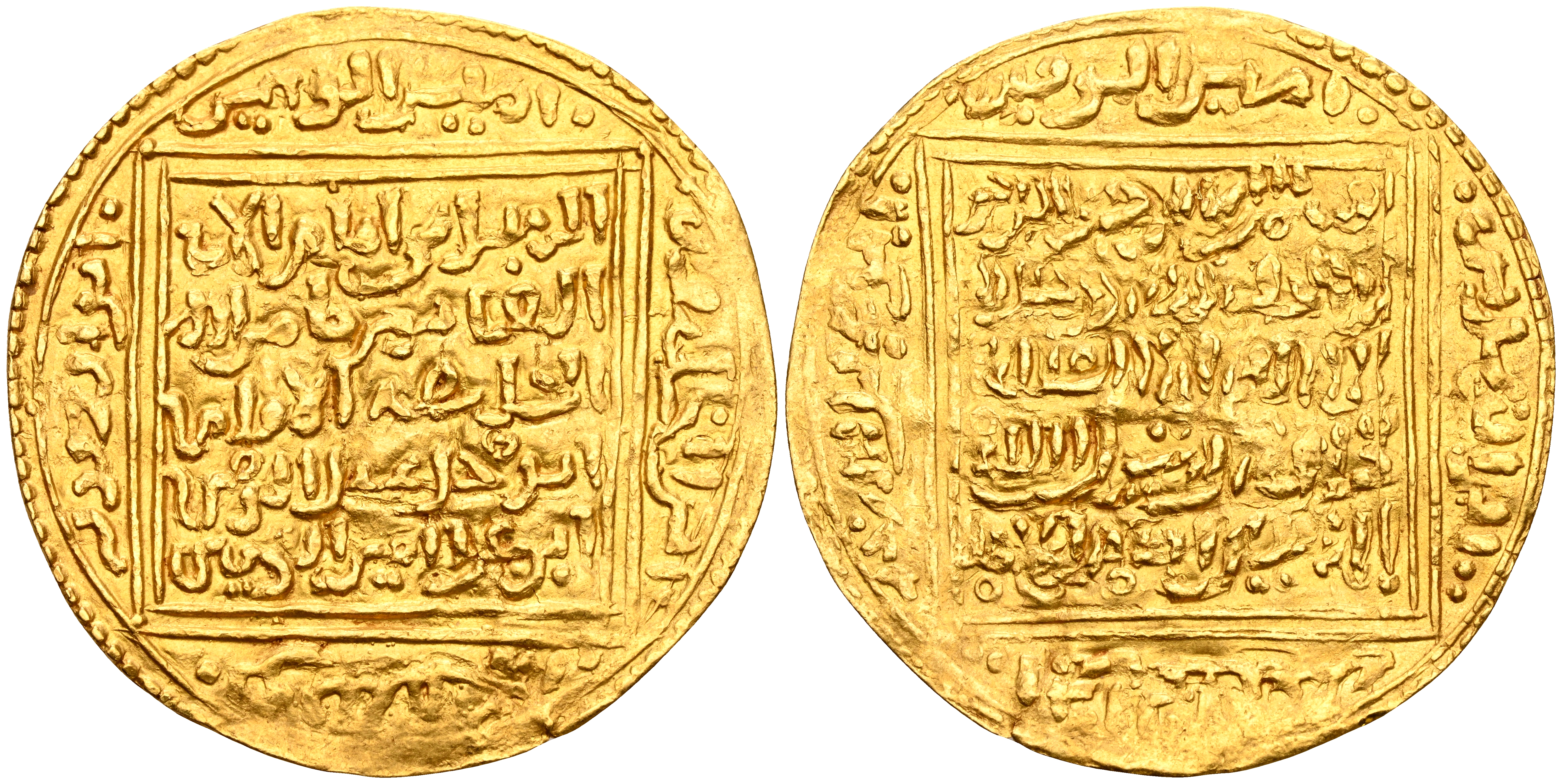 ALMOHADES, Muhammad al-Nasir. Dinar. (Au. 4,42g/31mm). 598-610H. (Vives 2074; Hazard H3 (pág. 231); Medina 178). Dinar híbrido, con anverso de Muhammmad (Vives 2073) y reverso de Abu Hafs Umar (Vives 2079). EBC-. Muy raro, tenemos constancia de solo 2 ejemplares más, subastados por Aureo & Calicó, en los ultimos 20 años, uno de ellos ofrecido en la colección Caballero de las Yndias, Subasta 218-3 (22/10/2009), Nº Lote 1457 y el otro ofrecido en la subasta selección de 2022, Subasta 387 (17/03/2022), Nº Lote 30, ambos rematados en 1700€ más su respectiva comisión.